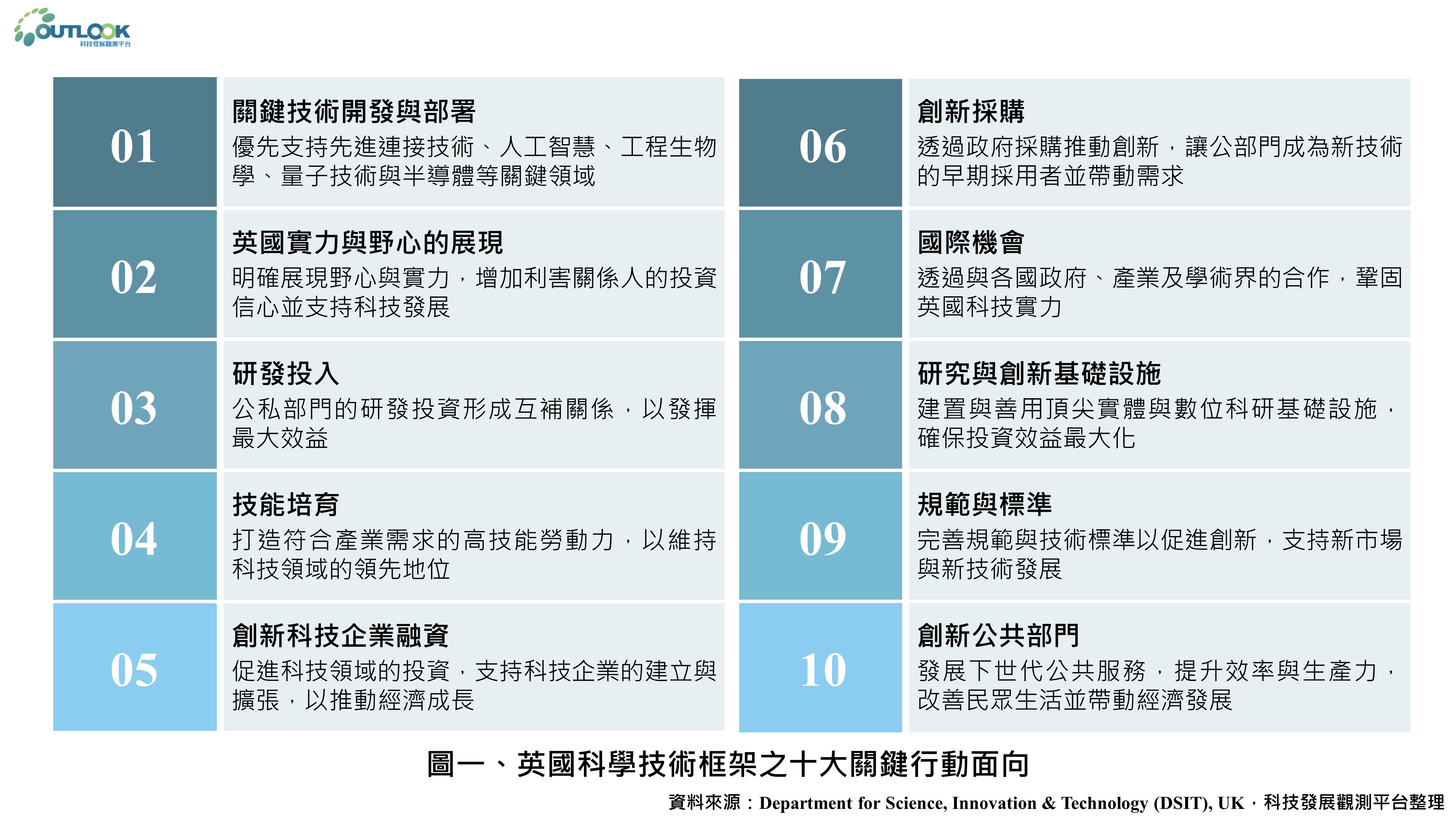 英國創新科技部(Department for Science, Innovation & Technology, DSIT)於2023年首次發布「英國科學技術框架」(Science and Technology Framework),提出十大行動面向及至2030年的成果目標。DSIT於2025年4月更新「英國科學技術框架」,進一步簡化內容。新版框架仍涵蓋十大關鍵行動面向,但未再設定目標年限或明確劃分各行動面向的權責部門。未來將由各部會共同推動框架內容,確保將科技置於產業發展核心,有效引導私部門投資並支持創新。