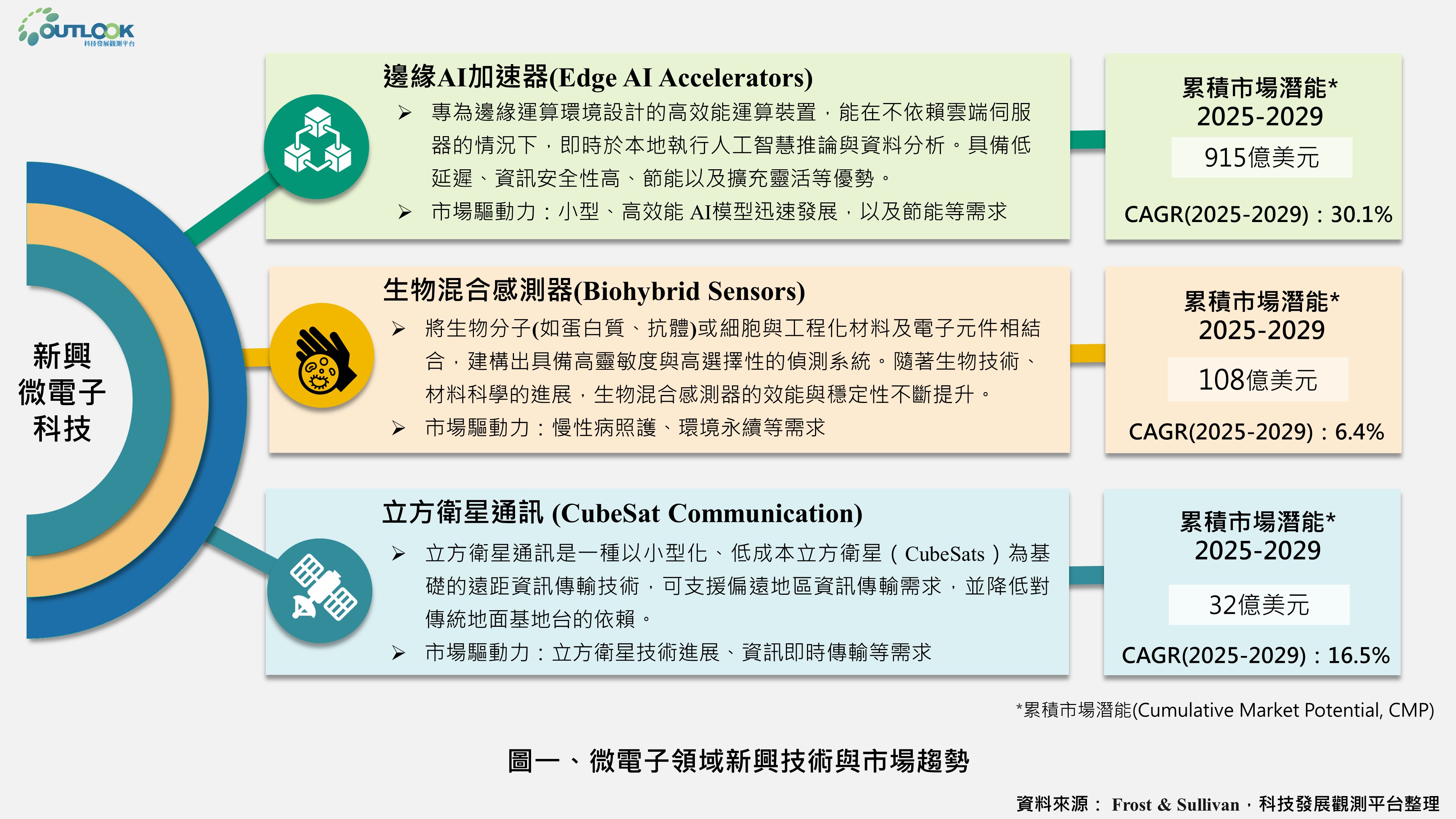 Frost & Sullivan在評估市場潛力、專利申請、募資狀態、經濟影響力等關鍵要素後,於微電子領域中,評選出多項未來2-4年內將對社會產生重大影響的新興技術,包括:邊緣AI加速器(Edge AI Accelerators)、生物混合感測器(Biohybrid Sensors)、立方衛星通訊(CubeSatCom)等。本文將針對前述3項新興技術,分述其定義、應用範疇、技術特點、代表性案例等(各項新興技術摘要與發展潛力請參閱圖一)。
