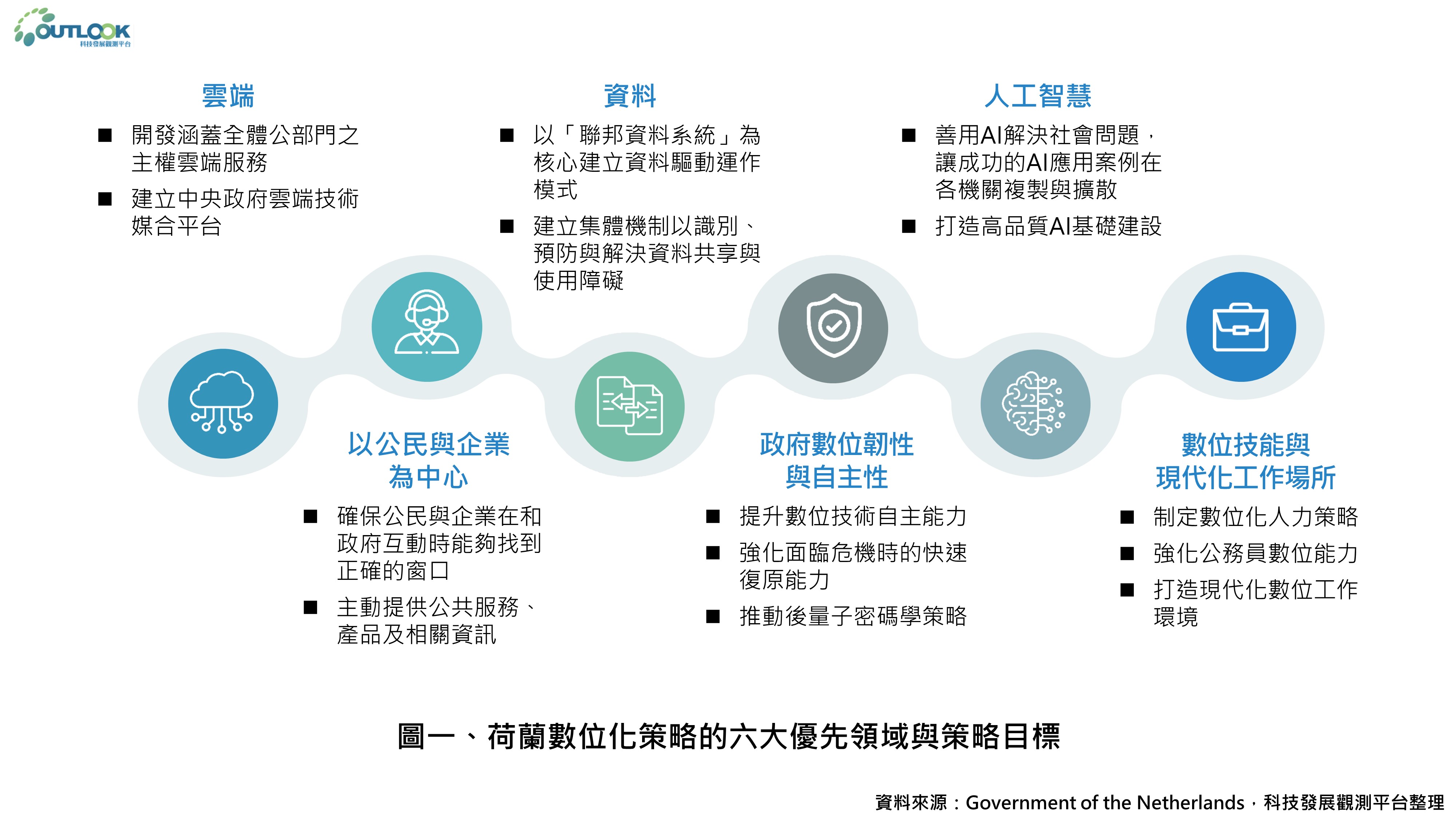 1. 策略目標:荷蘭將制定數位化人力策略、強化公務員的數位能力並更有效共享專業人才;同時打造現代化數位工作環境,提供公務員更好的工具與支援。
