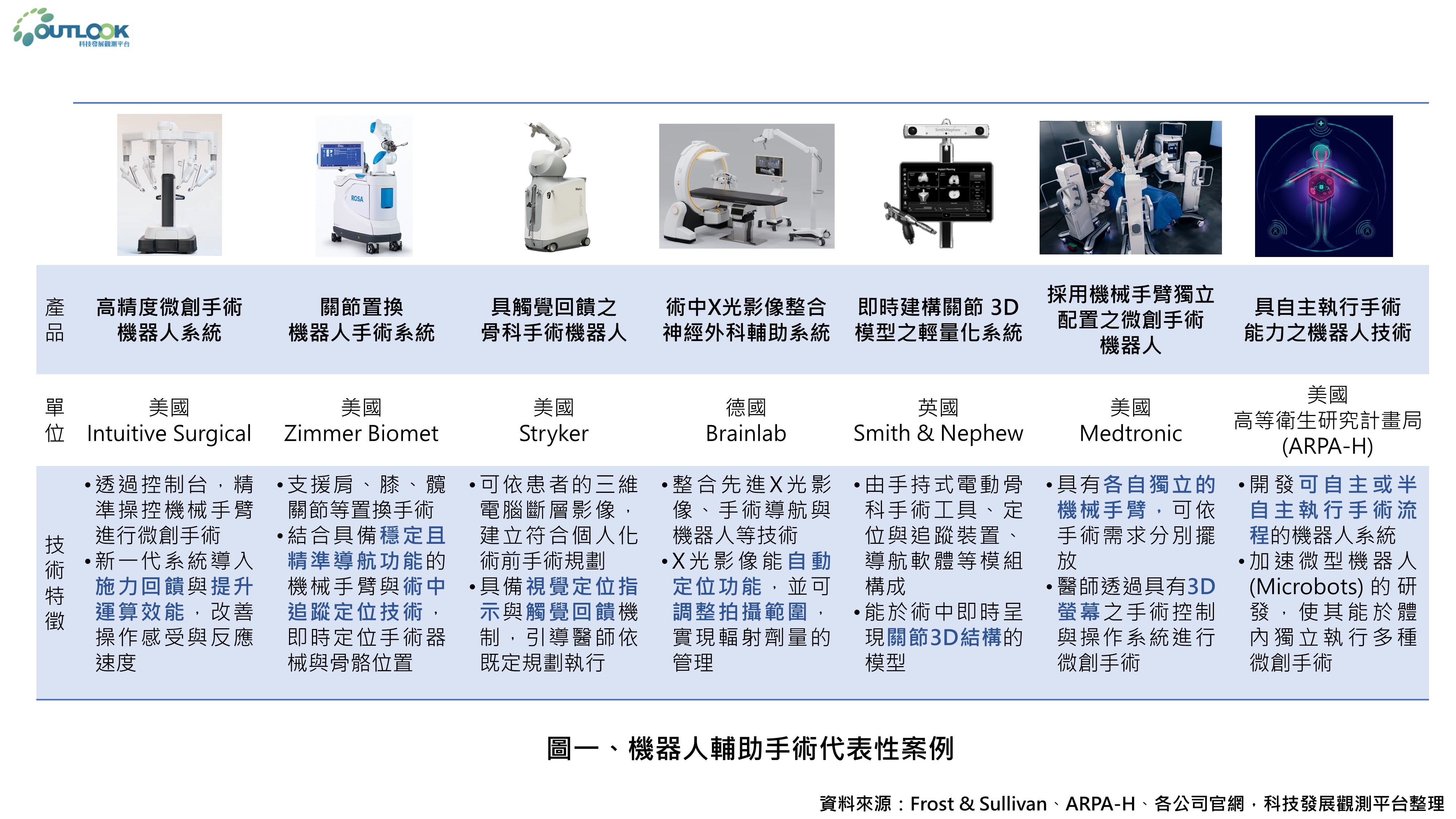隨著高齡人口及慢性疾病患者持續增加,心血管疾病、腫瘤及退化性關節等疾病之手術需求亦隨之提高。另一方面,人工智慧(AI)、擴增實境(AR)以及5G網路等新興數位科技正逐步導入手術相關應用,不僅有助於提升手術操作的精準度,也使醫師得以即時且清楚掌握手術畫面,進而帶動機器人輔助手術設備的快速發展。本文將介紹機器人輔助手術設備之代表性案例,其重點摘要如圖一所示。