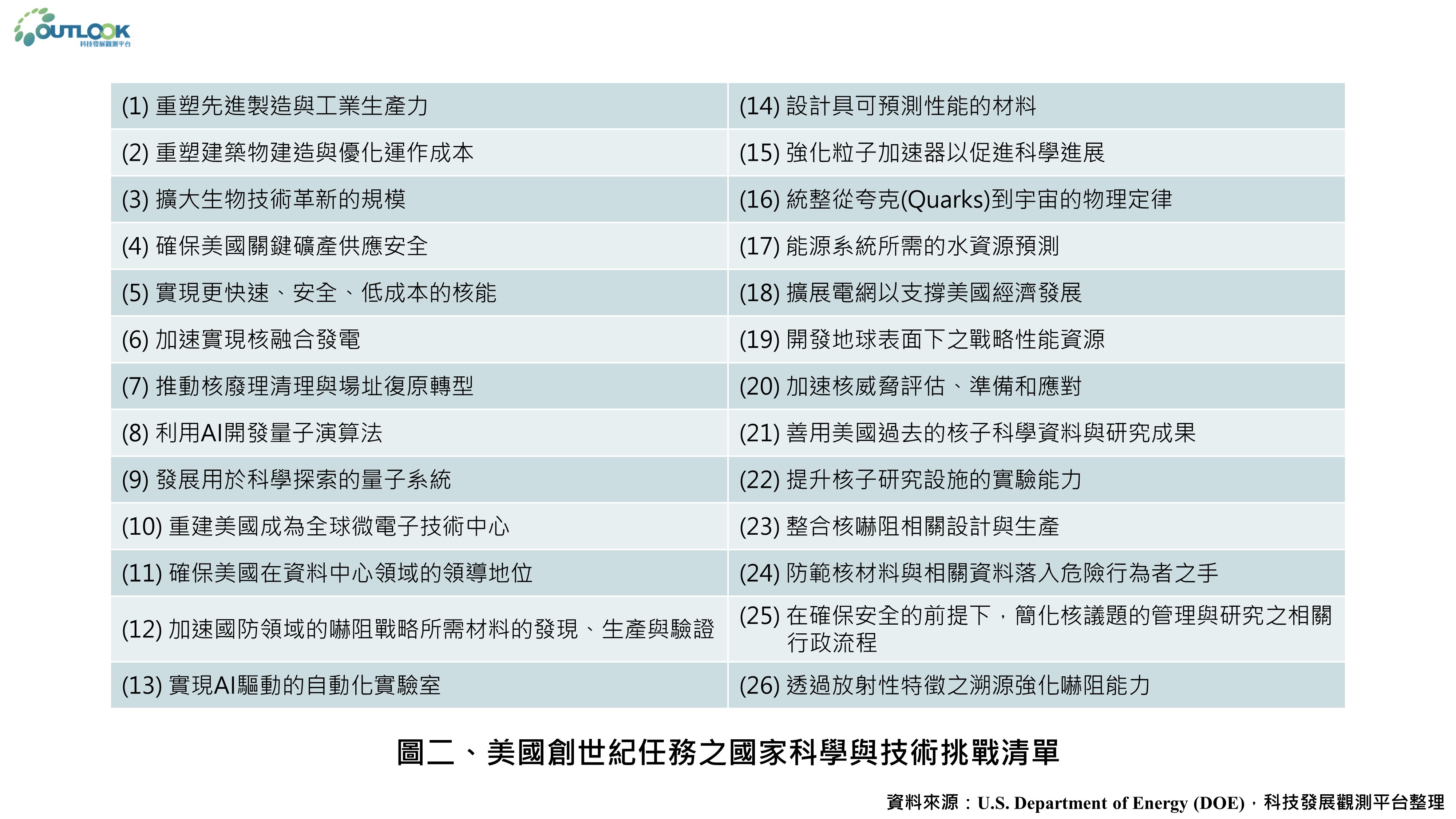 2026年2月,能源部發布「創世紀任務:國家科學與技術挑戰」清單(Genesis Mission National Science and Technology Challenges),涵蓋以下26項挑戰:重塑先進製造與工業生產力;重塑建築物建造與優化運作成本;擴大生物技術革新的規模;確保美國關鍵礦產供應安全;實現更快速、安全、低成本的核能;加速實現核融合發電;推動核廢理清理與場址復原轉型;利用AI開發量子演算法;發展用於科學探索的量子系統;重建美國成為全球微電子技術中心;確保美國在資料中心領域的領導地位;加速國防領域的嚇阻(Deterrence)戰略所需材料的發現、生產與驗證;實現AI驅動的自動化實驗室;設計具可預測性能的材料;強化粒子加速器以促進科學進展;統整從夸克(Quarks,為基本粒子,即物質組成的最小單位)到宇宙的物理定律;能源系統所需的水資源預測;擴展電網以支撐美國經濟發展;開發地球表面下之戰略性能資源;加速核威脅評估、準備和應對;善用美國過去的核子科學資料與研究成果;提升核子研究設施的實驗能力;整合核嚇阻相關設計與生產;防範核材料與相關資料落入危險行為者之手;在確保安全的前提下,簡化核議題的管理與研究之相關行政流程;透過放射性特徵之溯源強化嚇阻能力。