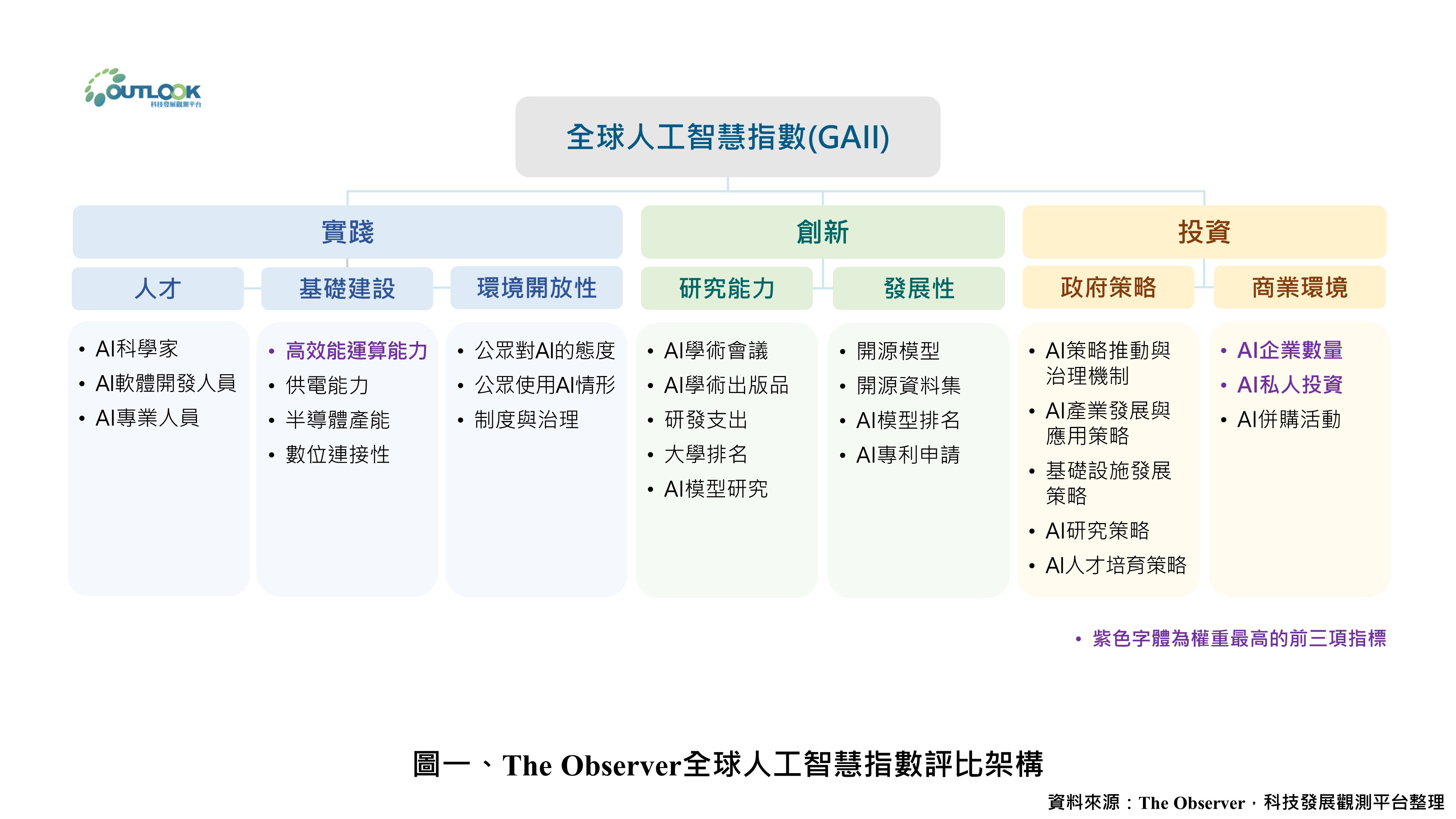 GAII的評比架構由「實踐」、「創新」、「投資」三大支柱,以及七個子支柱組成;每個子支柱涵蓋三至五個類別指標(如下圖所示),共包含108項細項指標。GAII於本年度調整部分類別指標與細項指標,新增供電能力、公眾使用AI情形、制度與治理,以及AI模型排名等類別指標,並移除AI人才留任、AI人才多樣性,以及AI立法活動等指標。