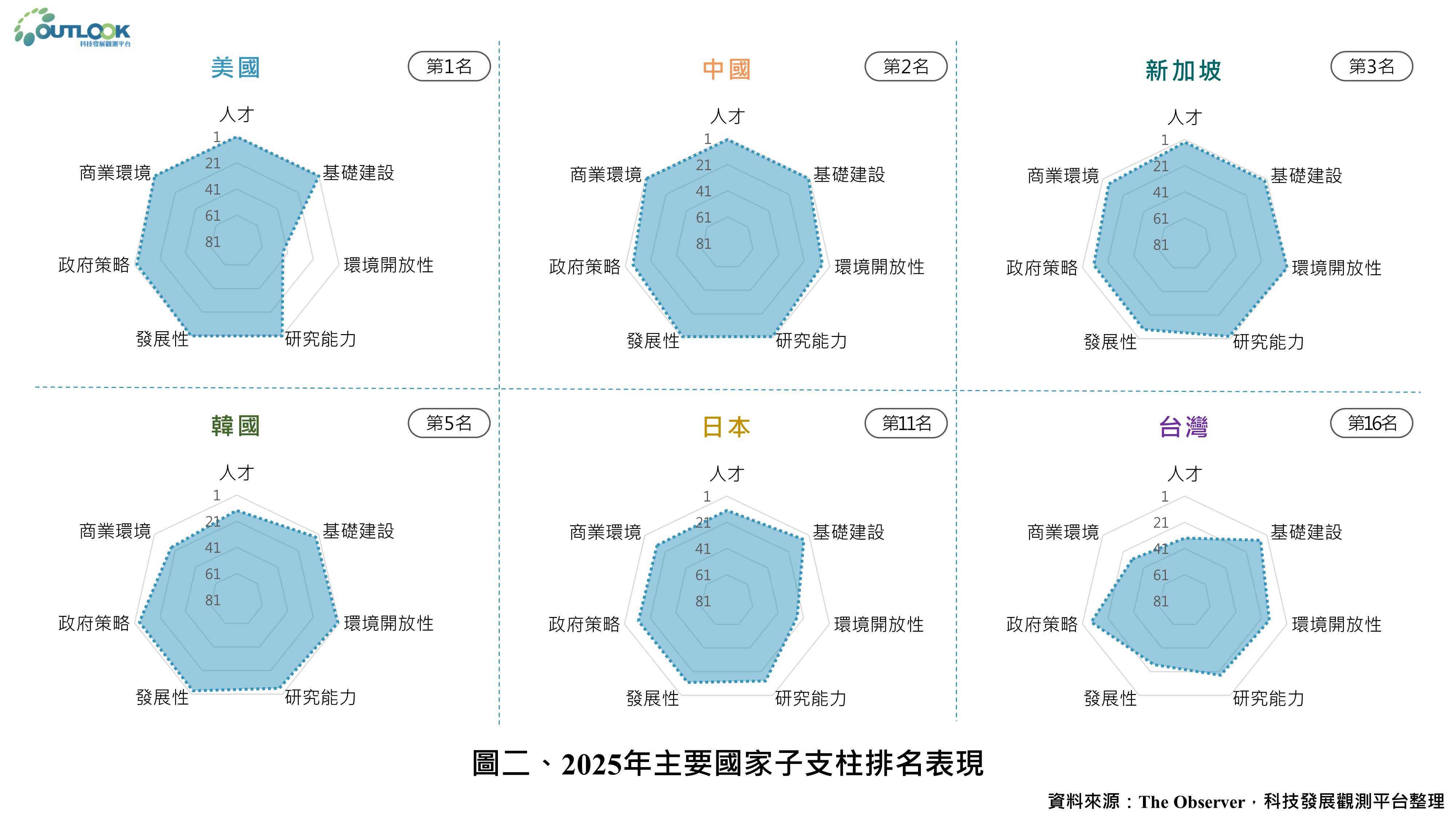 美國在「環境開放性」子支柱表現較弱,排名第45名,其餘子支柱均名列前茅;中國、新加坡、日本與韓國各項子支柱表現均衡發展,中國和新加坡所有子支柱均位居前十,韓國在「商業環境」(第17名)子支柱排名略低,日本的「環境開放性」子支柱表現則相對較弱,排名第26名。