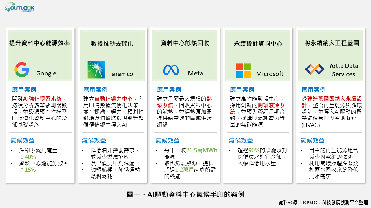 倫敦政經學院(LSE)的研究團隊檢視能源系統、交通運輸、農糧食品、製造和建築五大產業產生的氣候手印,預估至2035年,AI 每年可協助避免或移除32至54億噸二氧化碳,約為其自身排放量的3倍至8倍。換言之,AI 氣候手印的影響遠大於其碳足跡。圖一彙整AI驅動資料中心氣候手印的案例,並說明技術創新轉化為具體的能源效益與減排實績。