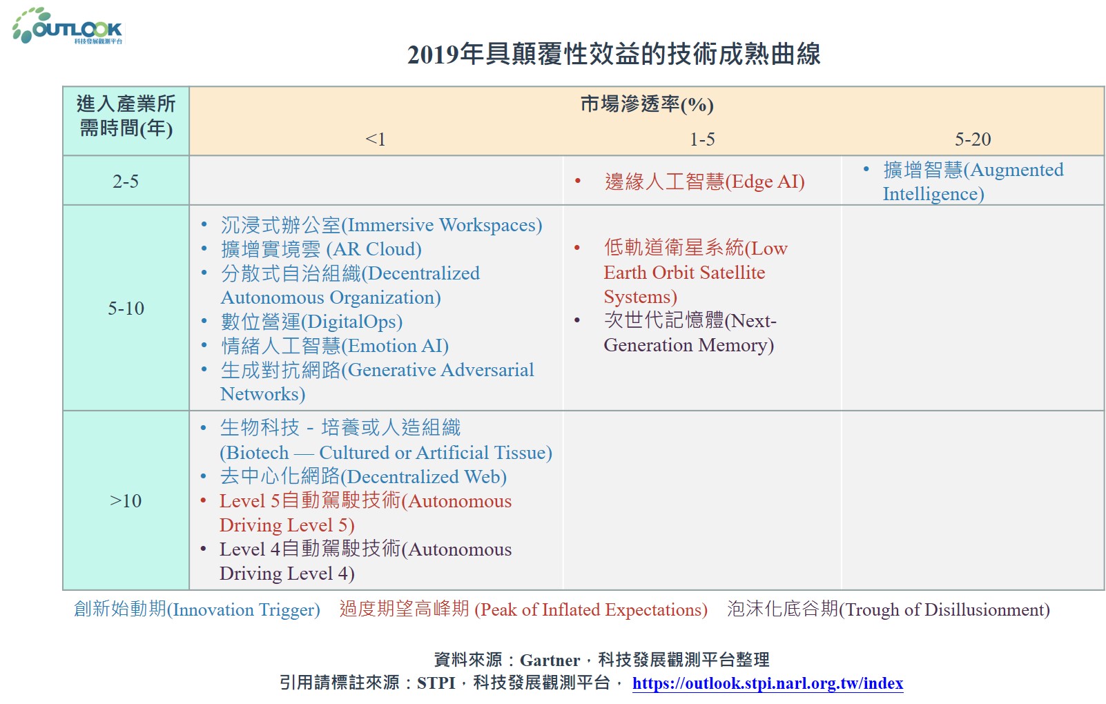 2019年的Gartner新興技術成熟曲線報告則著重於,探討過去技術成熟曲線報告中較少被提及,但在未來5-10年間會對商業、社會與人群造成重大影響的新興技術。此報告探討範圍圍繞在可提供全球低延遲性的網路、建立現實世界的虛擬地圖,以及模仿人類創造力等的技術。本文將摘錄Gartne報告闡述的五項新興技術趨勢,以及具顛覆性效益的新興技術進展。