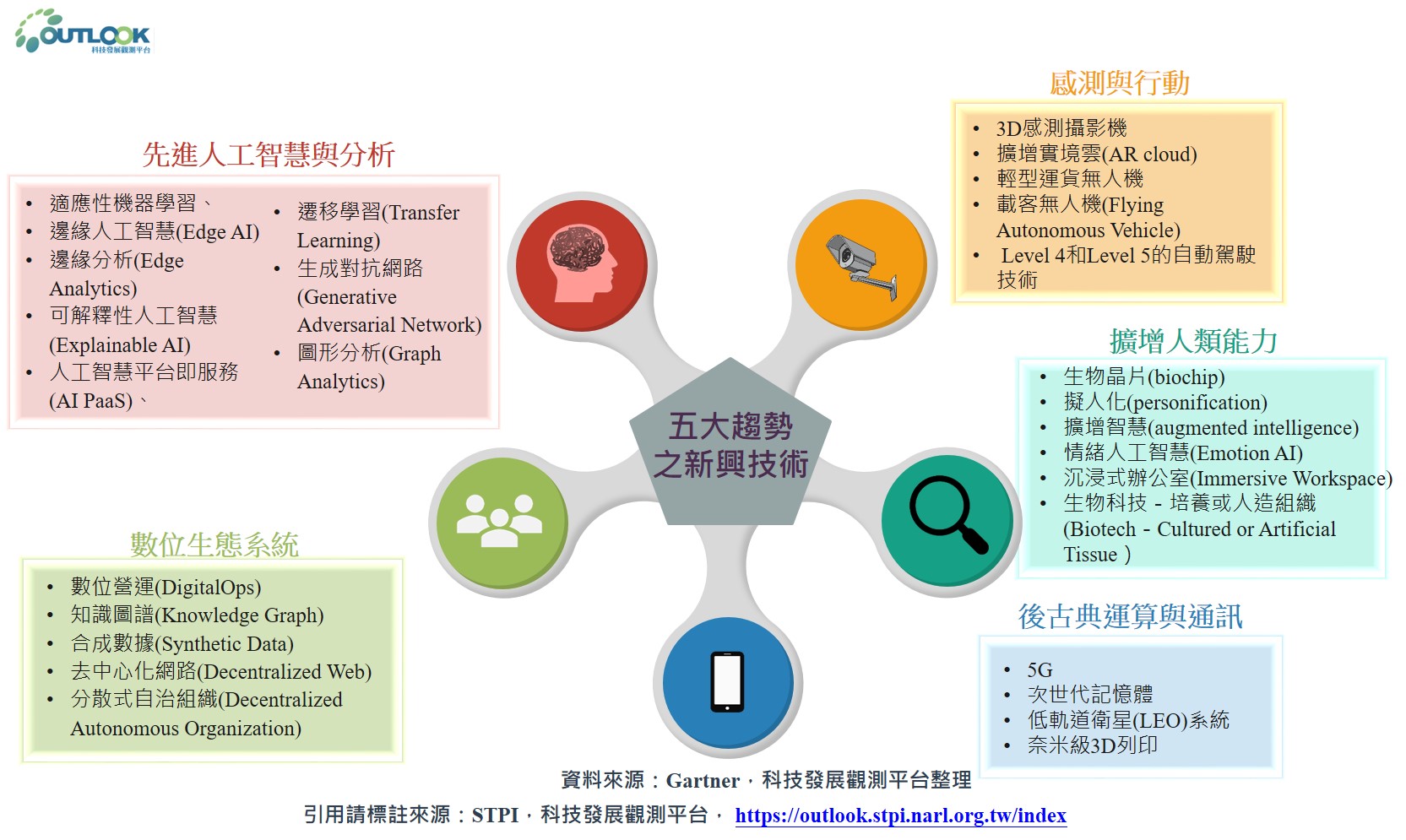2018年Gartner提出的五個新興技術趨勢,包含:(1)透過更為大眾化與普及化的虛擬助理、深度神經網絡(DNN)、對話式AI平台等相關技術,可解決過去無法解決的問題的「民主化人工智慧(Democratized AI)」;(2)需要大量資料與先進運算的「數位化的生態系統(Digitalized Ecosystems)」;(3)利用生物晶片與腦機介面等技術,以實驗改造與開發基因密碼,使人類開始進入超人類(transhuman)時代的「自製生物駭客(Do-it-yourself Biohacking)」;(4)持續朝著以人為本(Human-centric)方向演進的邊緣AI(Edge AI)與智慧職場(Smart Workspace)等技術,將持續消除人、企業與物品之間隔閡的「沈浸式體驗(Transparently Immersive Experiences)」;(5)利用5G提供全天候24小時雲端運算的「無所不在的基礎設施(Ubiquitous Infrastructure)」