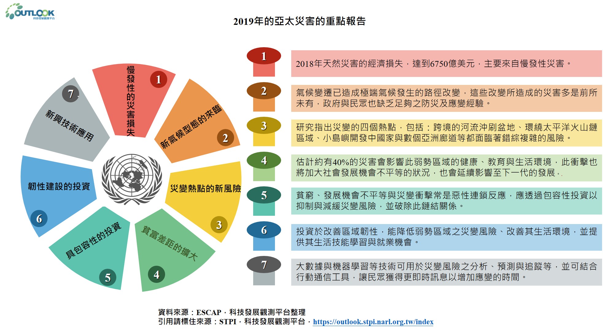 2018年全球重大天然災害達281件,約有半數發生在亞太地區,且全球災害最嚴重的前10件,有8件發生在亞太地區,災變的損失金額高達6,750億美元。報告顯示,災害對環境與社會經濟脆弱(socioeconomic vulnerability)區域民眾的衝擊,包含健康、就業及教育,將進一步造成持續性地惡性循環,若未能積極建立應變韌性,將使貧窮、不平等與邊緣化等現象將延續至後續數個世代。政府機構需要積極採取措施,並加速具韌性之基礎設施的投資腳步,才可減緩災變的影響力。舉例來說,應用智慧裝置、人工智慧與大數據分析等新興科技,建立精確的風險地圖,進而迅速掌握災害的發展,協助應變與復原工作。