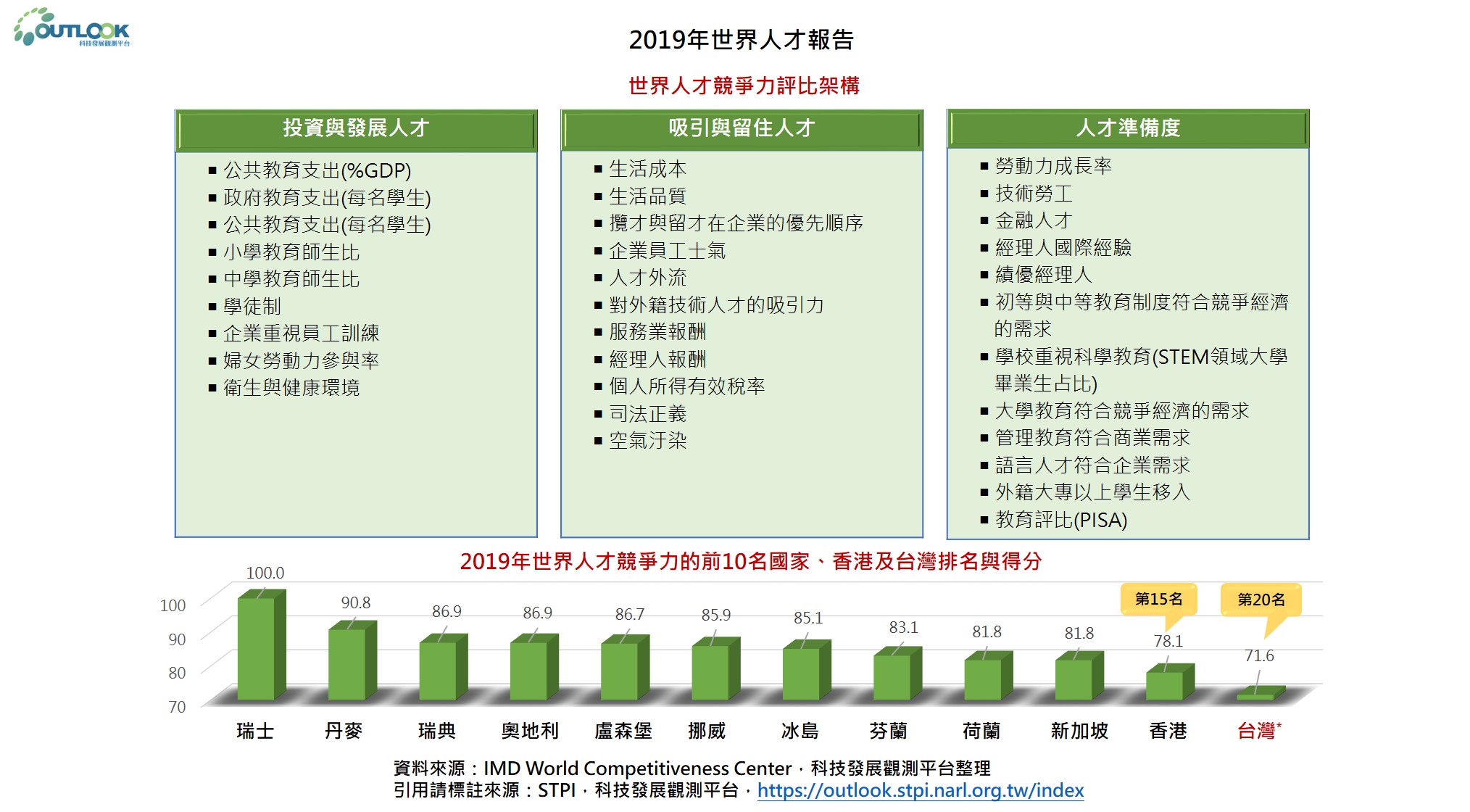 IMD的2019年世界人才競爭力報告,針對世界63個經濟體的人才競爭力進行評比,藉以研析各國的勞動力所具備的專業技能是否符合經濟發展所需,以及人才供需情況。人才競爭力的評比架構係以投資與發展人才(Investment and development)、吸引與留住人才(Appeal)、人才準備度(Readiness)三大項指標所組成。其中,投資與發展人才是衡量投資與培育國內人才資本;吸引與留住人才用以評估國家留住國內外人才與延攬國際人才的程度;人才準備度則是觀察國家可用的人才資本存量。而三大項指標又可細分為32個細項指標。