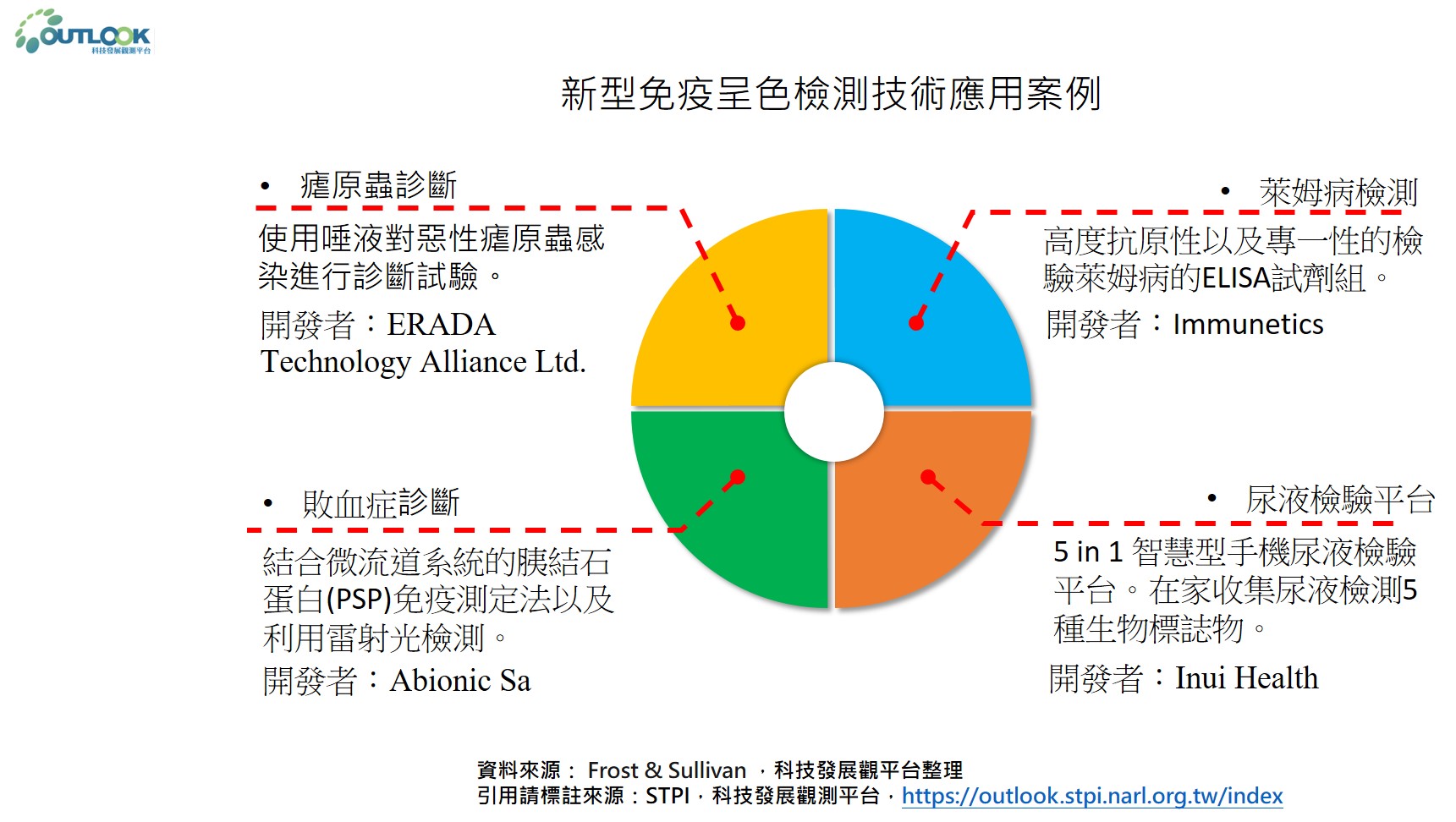 目前疾病診斷正朝向定點照護(Point-of-care)發展,尤其是傳染性疾病的控制。其概念是患者可在不需專業人員協助的情況下,隨時進行疾病檢測。另一方面,使用非侵入式的檢測方式,也是POC重要的一環,如使用唾液、尿液、拭子、汗水和呼吸做為檢體,可大幅減少醫護人員工作量,並可有效避免感染。綜上所述,理想的定點照護就是使用少量的樣品,利用可攜帶式的試劑及裝置,及時且快速提供準確的診斷結果。相關技術的進化仰賴於包括:微流道、人工智慧、計算機和生物資訊學、分子技術、奈米技術等,新科技的發展以及跨領域的整合。文中所提的四家公司,皆是將傳統的免疫檢測技術與新興科技作跨領域而成的新式疾病檢測平台,可視為新興免疫檢測發展的指標。