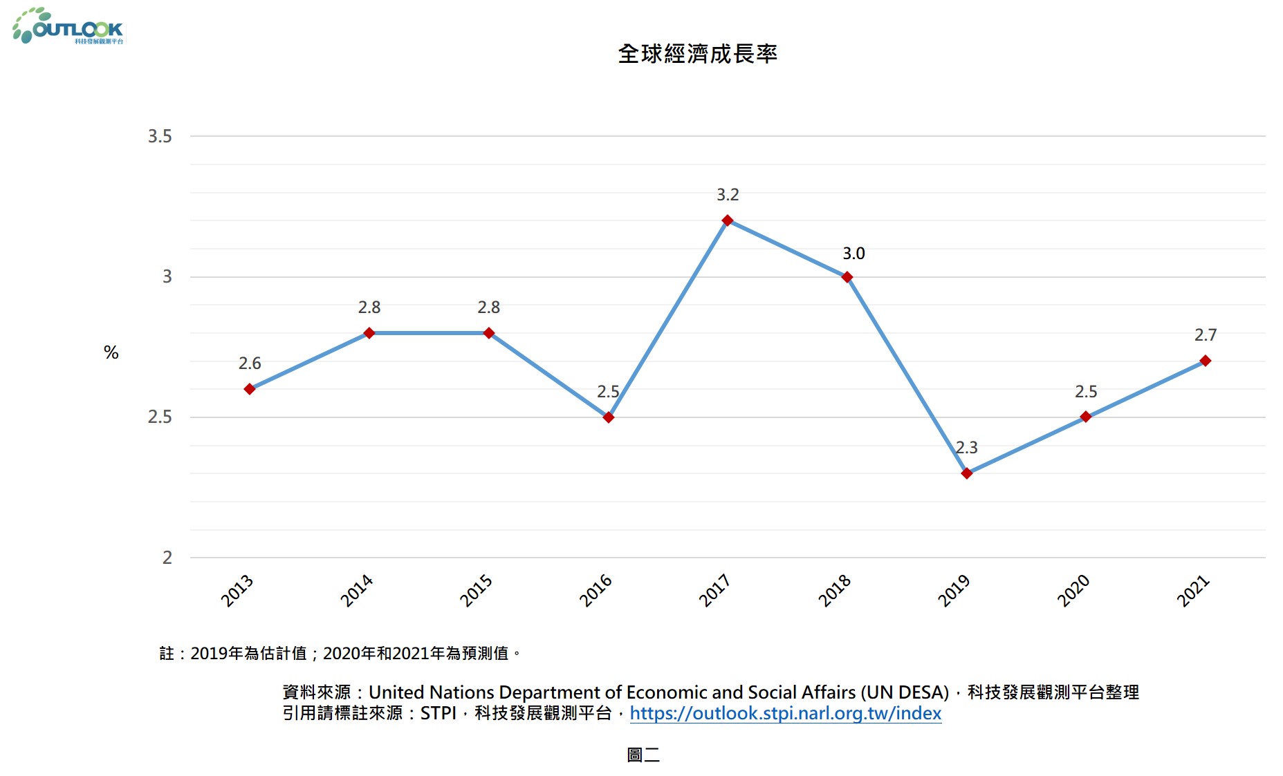 在長期的貿易爭端與諸多政策不確定性的環境下,世界經濟於過去一年明顯呈現惡化趨勢,經由圖二可知,2019年的全球經濟成長率估計將下降至2.3%,是自2008-2009年的全球金融危機以來的最低水準。而在全球貿易緊張局勢有所緩和,且假設潛在危機風險並未發生的前提之下,預估2020年的全球經濟成長率將會溫和回升至2.5%。