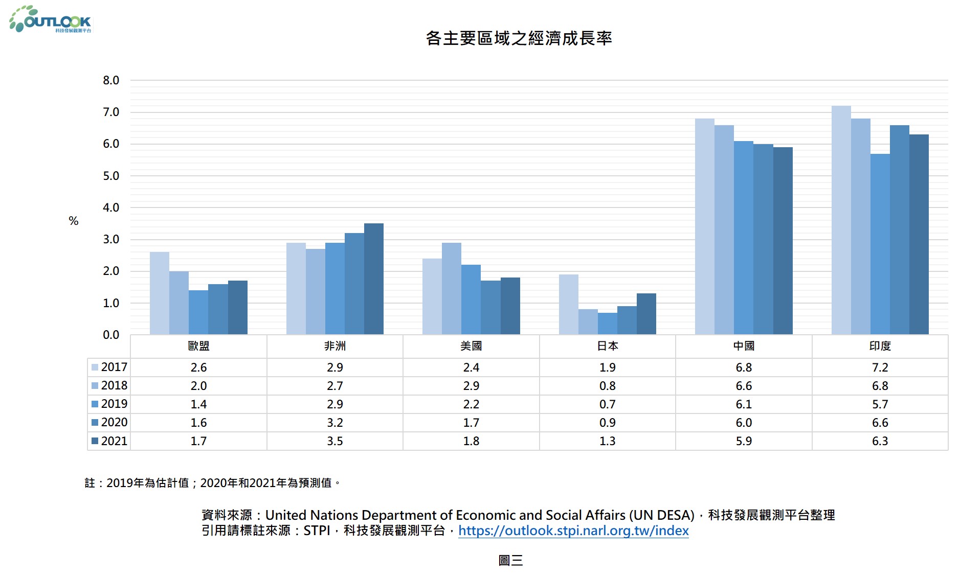 另從全球各主要區域之經濟成長率來看,如圖三所示,除非洲地區外,歐盟、美國、日本、中國、印度等國家的經濟成長率亦呈現放緩趨勢。除此之外,聯合國也估計全球約有三分之二的國家,2019年的經濟成長率會低於2018年的經濟成長率。這樣全球經濟成長放緩之現象,使得人們對於社會與經濟的發展,以及環境品質的期待與現實產生了落差。
