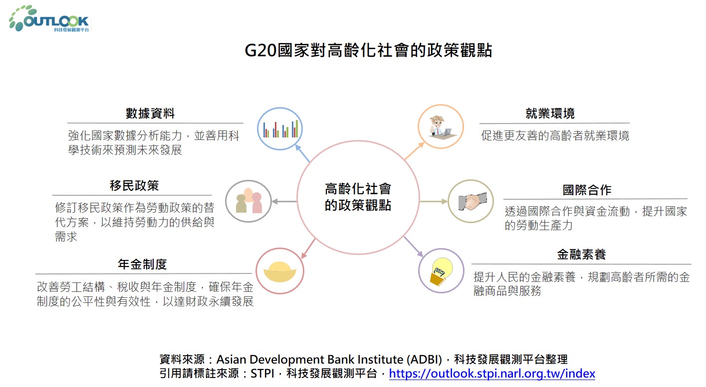 由於生育率下滑及平均壽命延長,全球正面臨著人口結構高齡化問題,對於社會與經濟的影響深遠。為因應高齡化社會所帶來的各種挑戰,各國應著手擬定各項政策措施,以推動包容性的經濟成長,建立良好的社會經濟體系,提供人民更為周全的經濟安全保障制度。有鑑於此,T20高峰會(Think 20,即G20國家智庫會議)針對人口高齡化與移民政策對社會與經濟的衝擊,訂定下列五大工作項目: