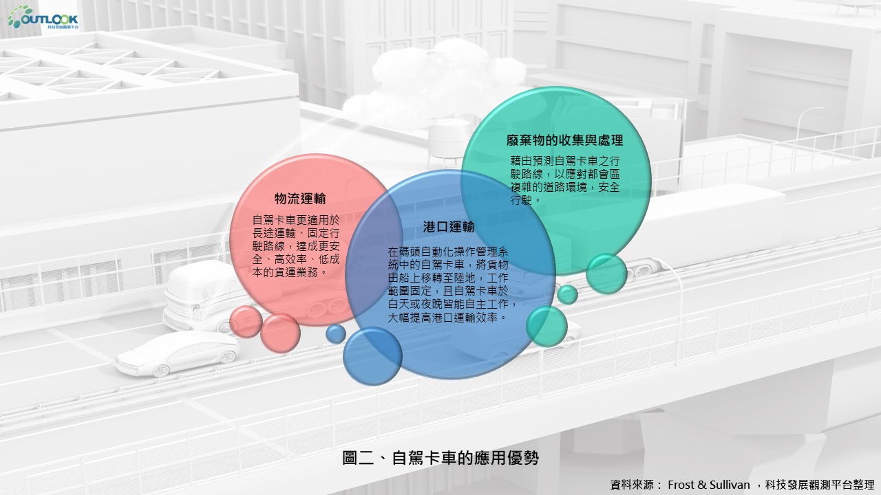 自駕卡車可作為長途運輸、區域遞送、專用作業之用途,提供新興的商業模式,提高貨運產業的效率、降低運營成本,未來,將藉由車輛廠商、網路技術公司的合作,致力開發軟體系統、傳動系統之技術,提升自駕技術,提供更高性能且更安全的自駕卡車。