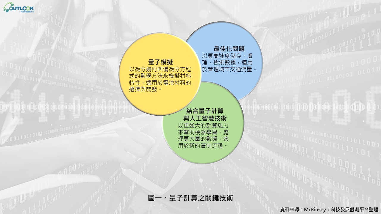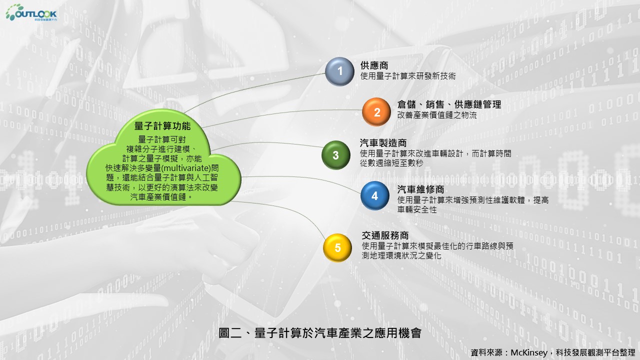 量子計算是一種直接利用量子力學定律進行計算的方式,目的在於提高計算性能,由於量子位元(qubit)的特性,計算能力以倍數成長,可同時探索大量的計算路徑,使量子計算變得更快,相較於傳統電腦的運算能力,量子計算具備非常強大的計算能力,可在短時間內解決複雜的問題,進而縮短產品的研發時程,因此,汽車產業正在探索量子計算之應用潛力,以提高產業價值。依據McKinsey研究顯示,在2025年到2030年間,量子計算將對汽車產業產生重大經濟影響,用於處理大量數據,加快自駕車之學習速度、加速新技術的研究與開發、提供車輛最佳的行駛路線,以及找出車輛製造的最佳方法與材料參數,進而增加車輛安全。