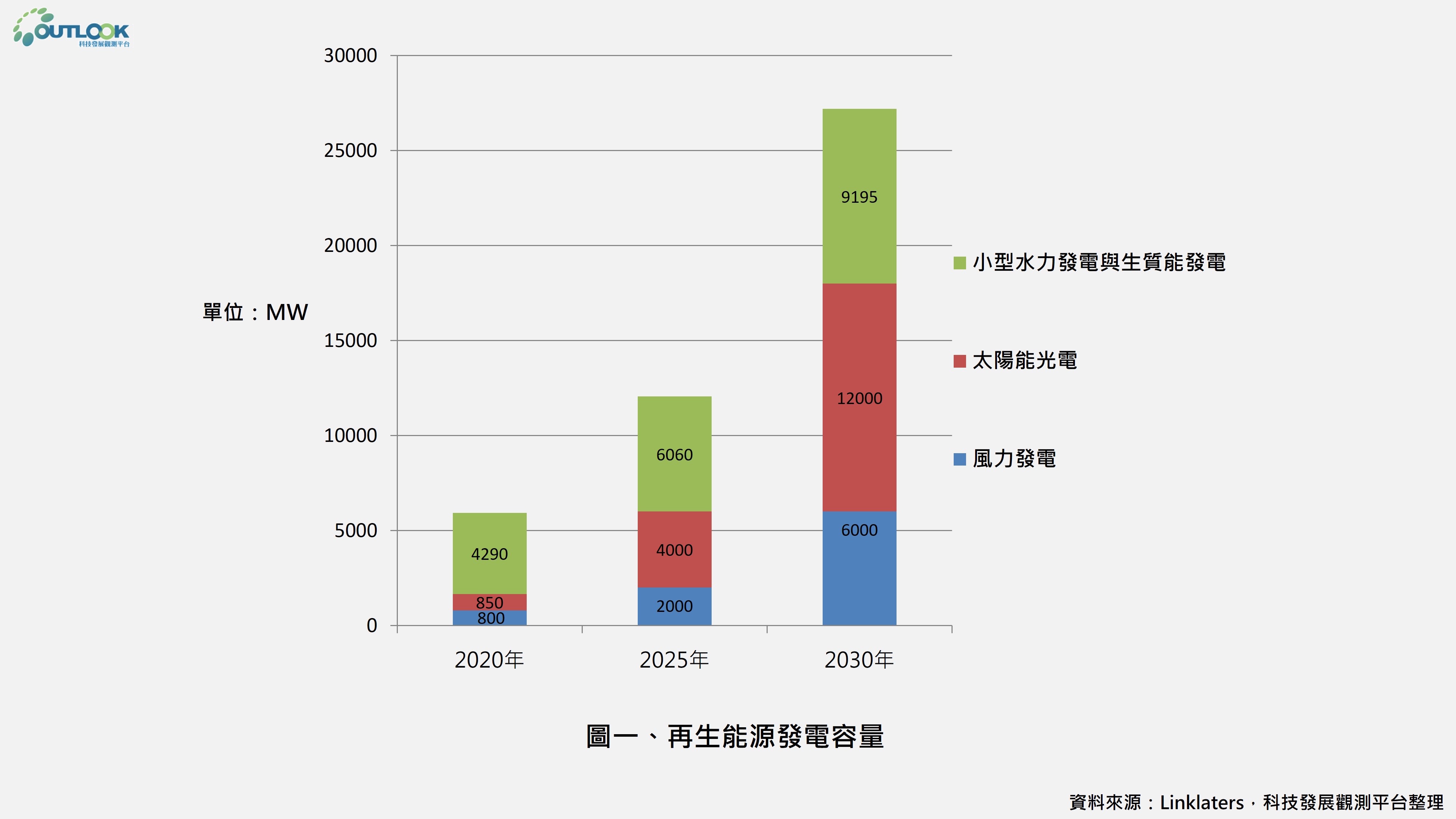 2. 在風力發電領域,規劃2020年達到800MW;2030年達到6 GW的目標 (如圖一)。