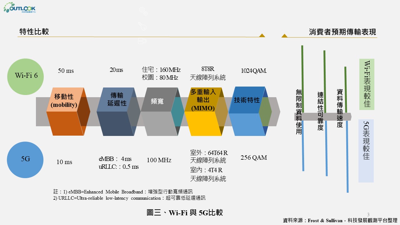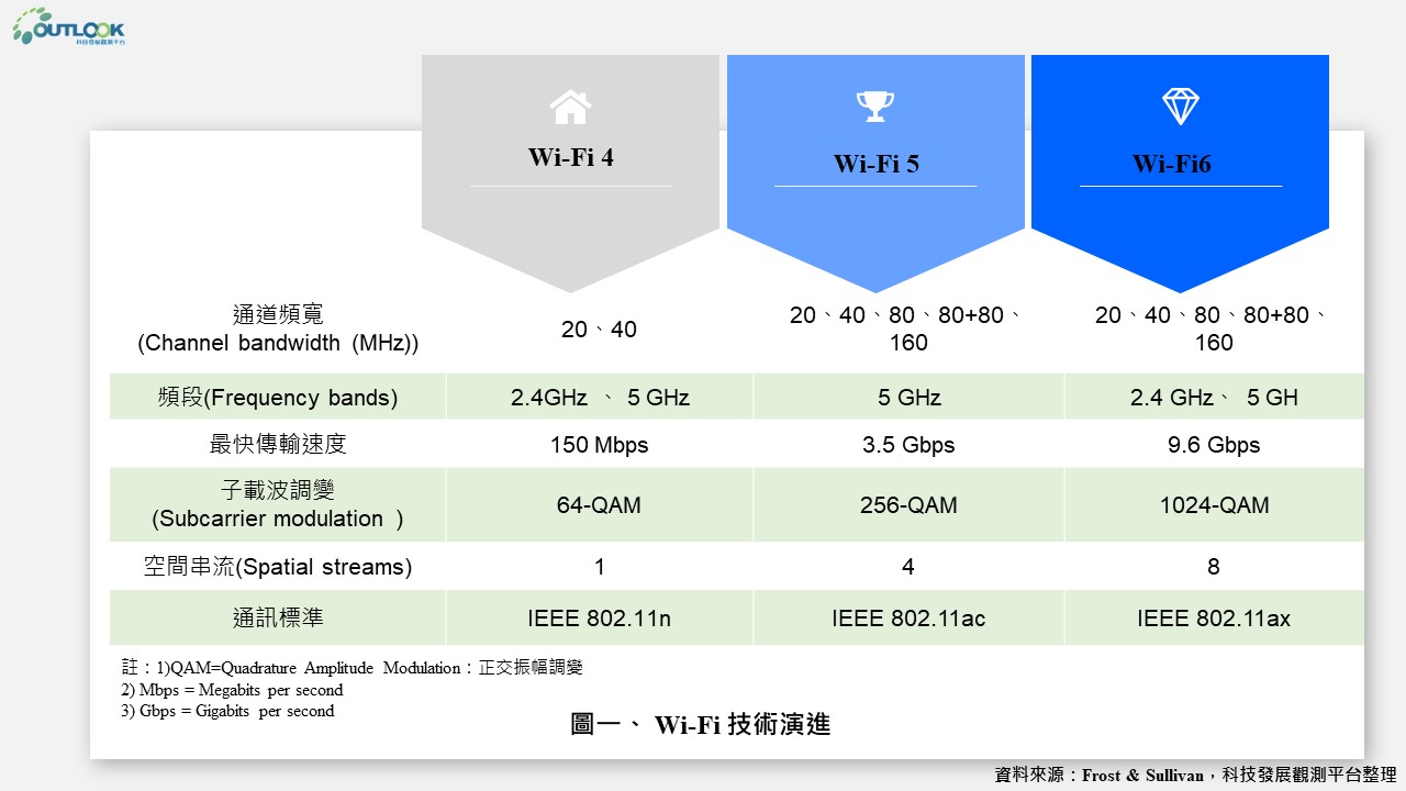 大眾對結合新興技術的數位解決方案的接受度提高,如物聯網、虛擬實境與擴增實境,以及對遠距工作、即時攝影、工業自動化等需求,進一步強化無線網路傳輸發展的壓力,在更快的傳輸、更低的延遲性等需求下,預期企業將著手翻新既有的無線網路。Wi-Fi 6 (IEEE 802.11ax)為Wi-Fi 5傳輸速度的3倍(以每秒傳輸Gigabits估算),是被設計用於室外與室內的高效率傳輸,且能應用於執行低延遲與低訊號干擾的關鍵任務。本文彙整Frost & Sullivan與IDC論述Wi-Fi 6規格與應用、比較Wi-Fi 6與5G傳輸,以及Wi-Fi 6市場發展預測與重要廠商。