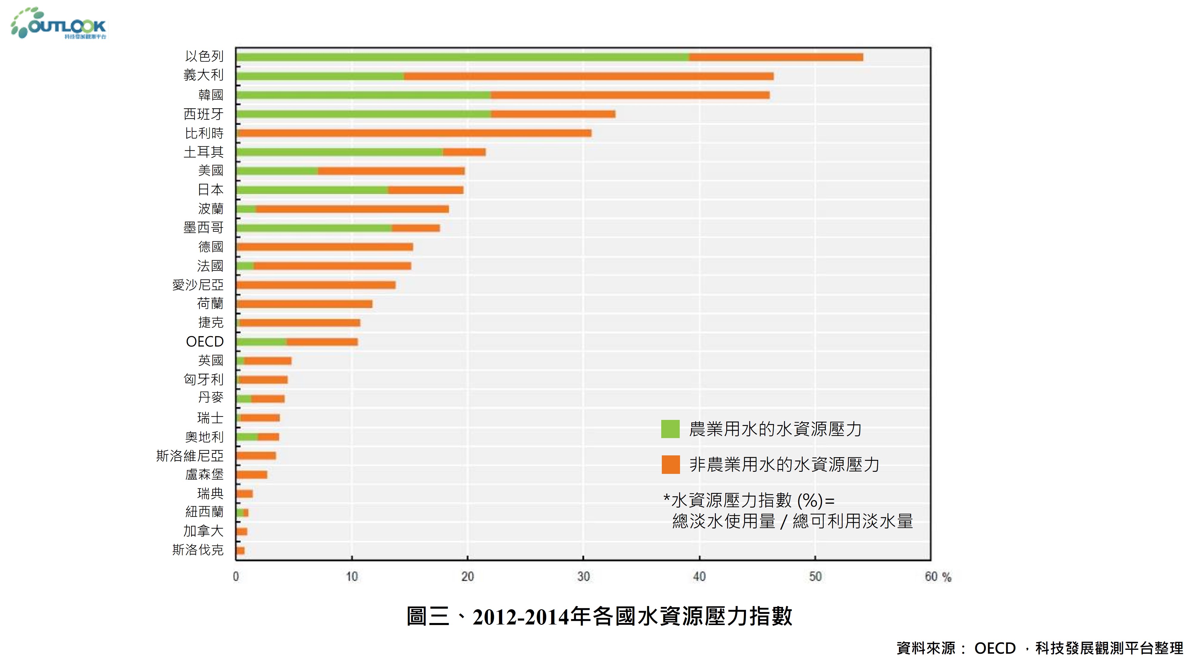 人口成長、城市化和氣候變化使得水資源日益受到威脅,使水資源管理顯得格外重要。水資源壓力 (water stress) 指標可以反映國家是否能滿足人民基本用水需求,該指標是計算人類在某區域內每年用水量與該區域內可用水量之比例。多數國家的農業用水壓力佔總用水壓力比例高,尤其是以灌溉為主的國家(圖三)。自2005年來大多數OECD國家總用水量減少(圖四),因此水資源壓力指標皆略有下降。其中,農業用水量每年約下降0.4%。