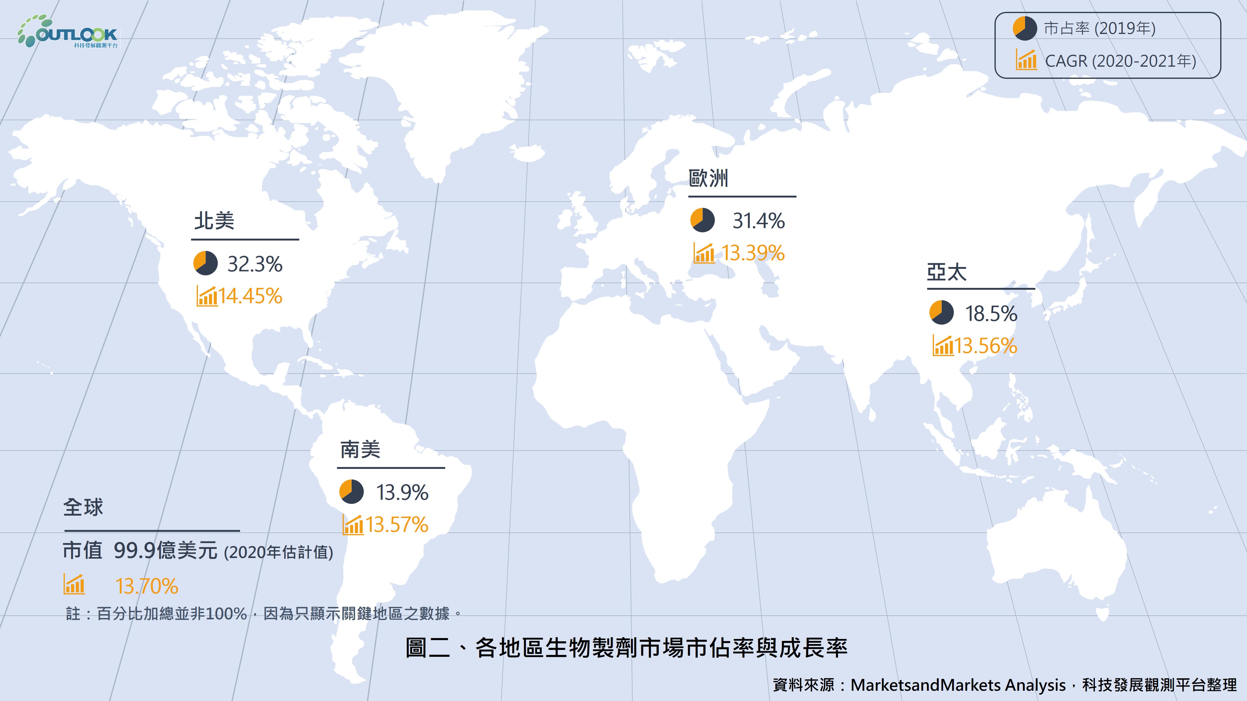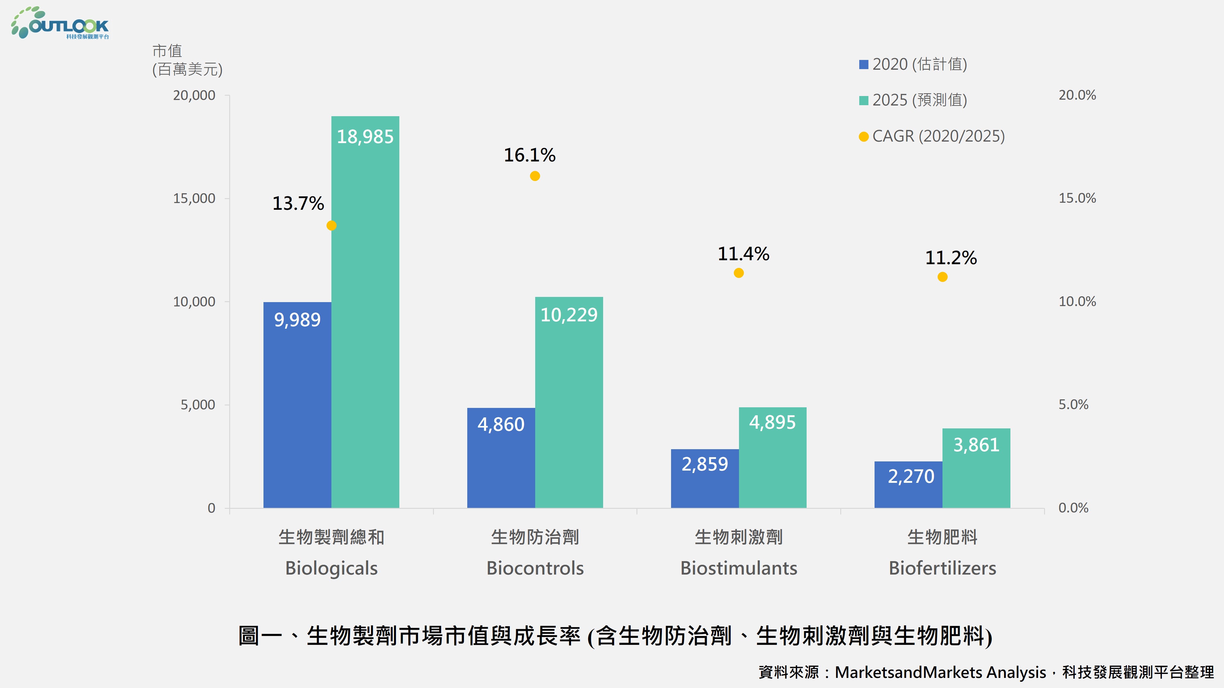全球農業生物製劑市場預計將從 2020 年的 99.9 億美元,成長至 2025 年的 189.8 億美元,CAGR為13.7%(圖一),其主因為國際永續農業發展的趨勢、有機食品的需求增加、以及政府對使用化學方法在植物保護措施的規範日益嚴格。本文介紹生物製劑的分類、市場概況、與各國法規的主要趨勢,以供相關領域者參考。