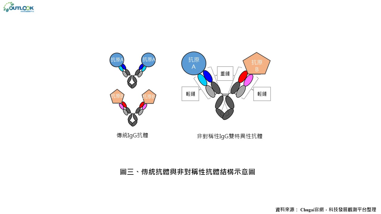 Chugai在血液學領域擁有多年的經驗和專業知識,A型血友病是由凝血因子VIII(Factor VIII)的遺傳性缺陷或功能異常所引起而導致血液流失,Chugai利用專有抗體工程第一代技術ART-Ig®生產模擬Factor VIII的雙特異性抗體(Hemlibra)用以治療血友病患者。Chugai的第二代技術FAST-IgTM®可提高大規模生產能力並擴展應用到其他類型腫瘤,相較於第一代ART-Ig®使用常見的輕鏈(Light chain),第二代FAST-IgTM®可以自由地獨立設計兩條輕鏈,並允許設計具有複雜作用方式的雙特異性抗體,圖三為其結構示意圖。該第二代技術所開發的 NXT007(anti-FIXa / FX)目前已進行到臨床試驗的第I / II階段。 Chugai未來也預計開發新穎的第三代雙特異性抗體技術,期望能開發出可調控抗體以結合到兩種目標抗原上。