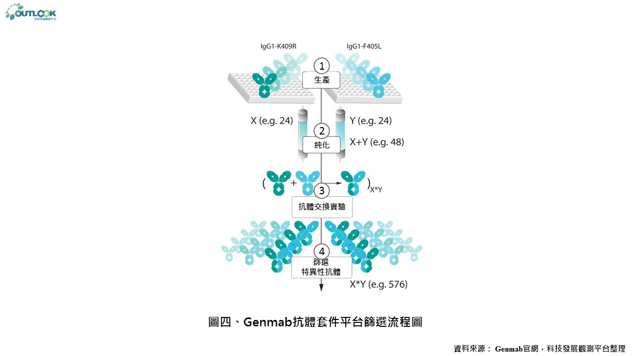 Genmab是全球抗體工程領域的著名創新公司,其利用自行開發之DuoBody®、HexaBody®、DuoHexaBody®和HexElect® 等抗體套件平台來建構具有IgG樣特性、穩定、功能強大且易於製造的雙特異性抗體。 DuoBody®技術包含幾個主要步驟:第一為使用重組哺乳動物表達系統分別生產兩個IgG1抗體,每個IgG1進行單突變(其一突變點為K409R;另一突變點為F405L)。第二步驟為純化這兩種IgG1抗體。第三、四步驟則為將兩種抗體進行受控Fab臂交換實驗,並透過篩選從而產生雙特異性抗體,通常能有很高的產率(> 95%),整體流程顯示如圖四,且該DuoBody®技術可以容易地應用在開發和商業規模上。Genmab有2項專利候選藥物正在臨床試驗的第I / II期中,以及有3項專利候選藥物正在臨床試驗的第I 期中,還有超過15個雙特異性抗體藥物是利用Genmab的技術合作開發的。另外,最有潛力的候選藥物Epcoritamab(DuoBody®-CD3xCD20)目前正處於臨床試驗的第I / II期中。 於2020年4月發表的最新研究顯示DuoHexaBody CD37有望用於治療B細胞惡性腫瘤。