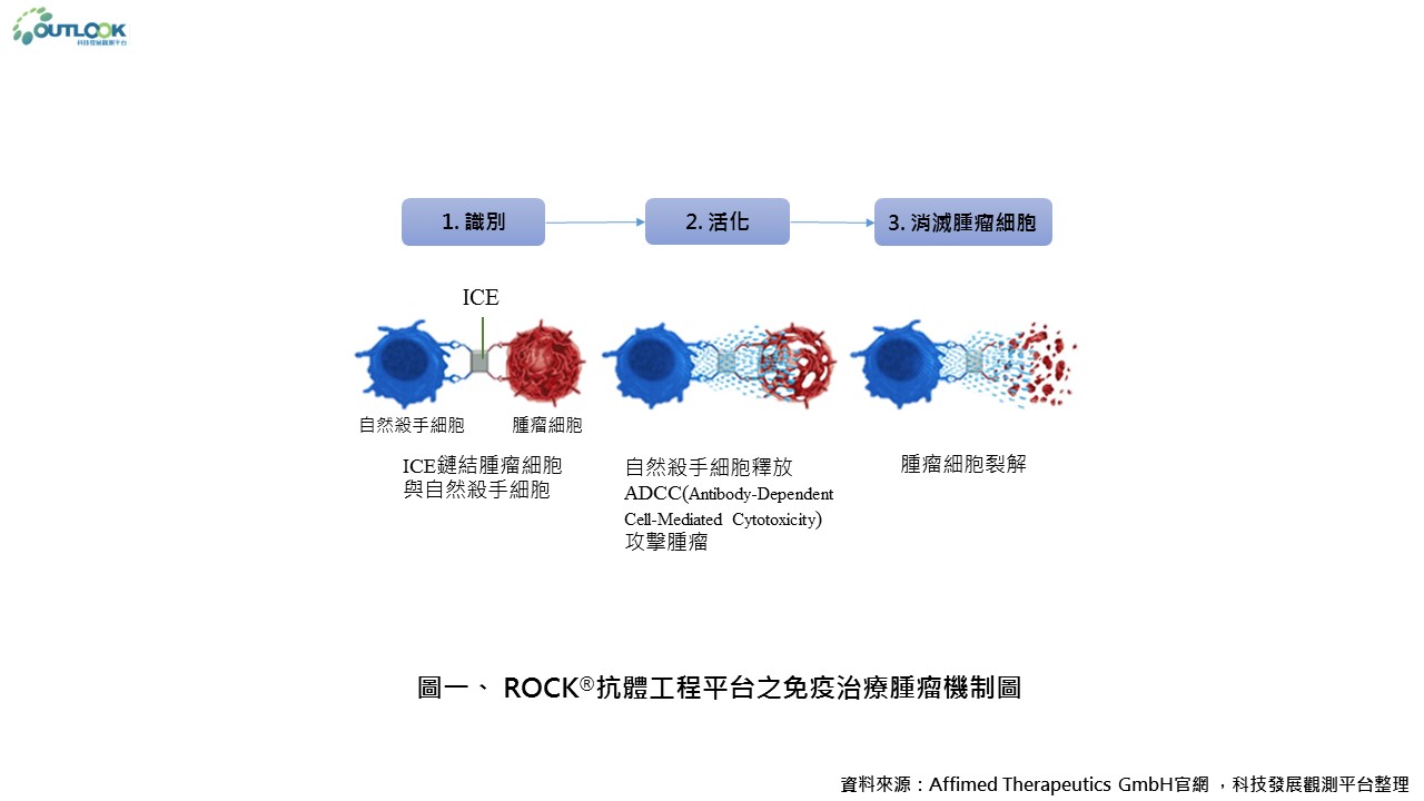 Affimed Therapeutics GmbH是開發利用先天性免疫系統進行優化免疫治療腫瘤的公司。Affimed Therapeutics GmbH所開發的抗體工程平台ROCK® (Redirected Optimized Cell Killing)可以生產具有雙特異性或多特異性先天細胞接合劑(Innate Cell Engager,ICE®)抗體分子。 ICE®是以高度親和力激活先天免疫系統,透過多管齊下的方法幫助克服腫瘤免疫逃逸機制(Tumor Immune Evasion Mechanism)以識別腫瘤,並恢復啟動免疫反應。該抗體平台之治療機制如圖一。Affimed Therapeutics GmbH的主要ICE®候選藥物AFM13是標靶CD30淋巴瘤的雙特異性先天細胞接合劑,目前處於臨床試驗的第II期。而Affimed Therapeutics GmbH的第二個候選抗體藥物AFM24用來標靶治療實體瘤,目前處於臨床試驗的第I 期。此外,Affimed Therapeutics GmbH在2018年與Genentech的合作共同開發用於治療多發性骨髓瘤的雙特異性抗體。