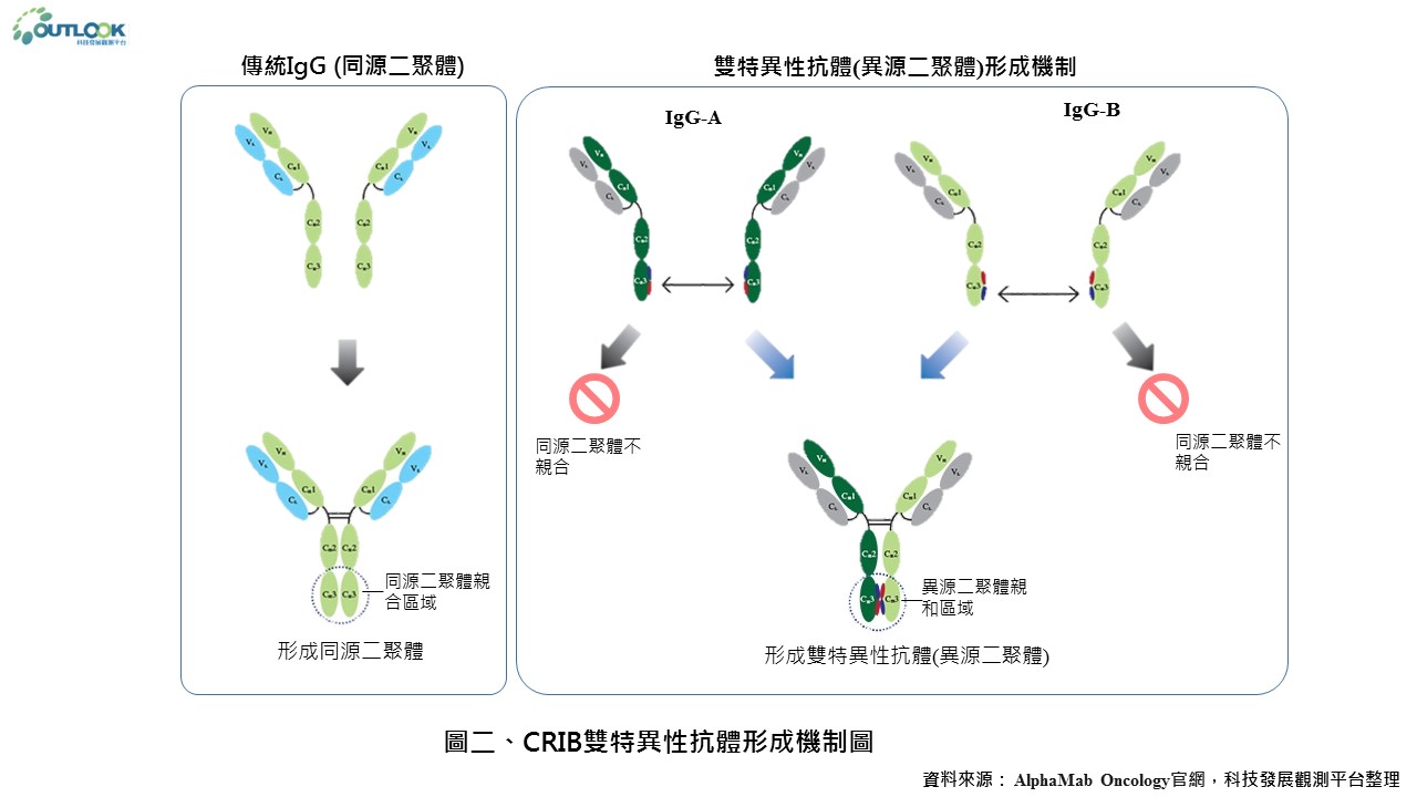 AlphaMab Oncology所開發的平台CRIB® (Charge Repulsion Induced Bispecific) 能夠形成以異源Fc-domain結合的天然雙特異性抗體,詳見圖二。AlphaMab Oncology的候選藥物KN046(雙重阻斷PD-L1和CTLA-4)用於標靶多種類型的腫瘤(包括NSCLC、TNBC、ESCC、HCC和胰腺癌),目前正在澳洲、中國和美國進行臨床試驗的第I / II期。而另一個候選藥物KN026(雙重阻斷HER2的domain II和domain IV)正於美國和中國進行臨床試驗第I / II期和第I期,且KN026的CMC製程已經發展成熟能夠穩定高產量生產純度高的雙特異性抗體。AlphaMab Oncology於2020年3月與Pfizer公司合作以Ibrance®(Palbociclib)與KN026共同研究,於2020年6月與Sanofi公司合作推進KN026的臨床研究將與Taxotere®(多西紫杉醇)聯合治療HER2乳腺癌。