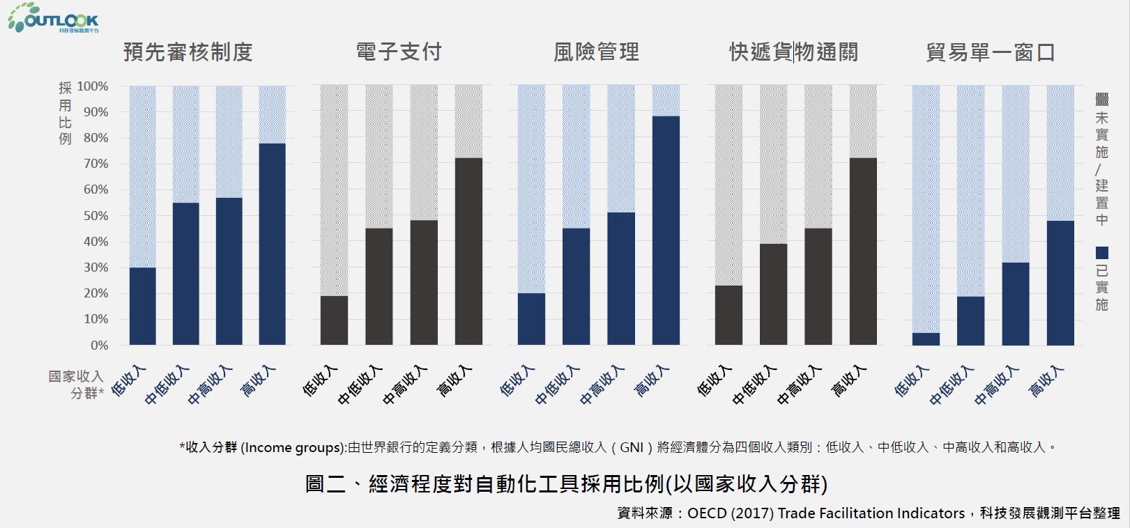 圖二顯示不同經濟程度的國家對WTO貿易便捷化協定(Trade Facilitation Agreement, 簡稱TFA) 下採用的各種貿易數位化之應用程度,包含預先審核制度、電子支付關稅、風險管理、快遞通關、貿易單一窗口等。根據TFA的統計,約有一半的中低/中高收入國家使用電子支付關稅和其他相關收費的系統,亦串聯自動化的申報處理系統、數位證書和簽名,並使用電子數據交換系統,然低收入國家的建置比例則較低。