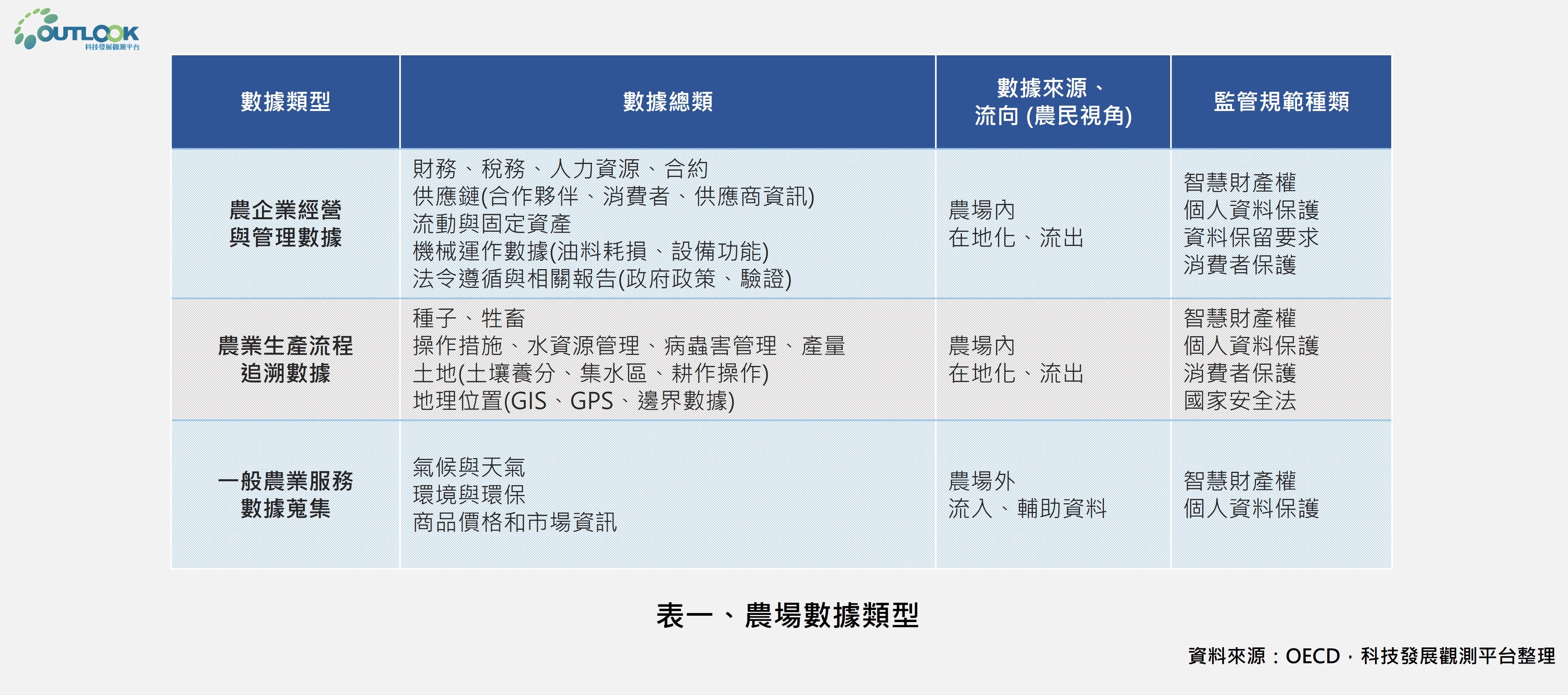在目前的法律架構中,尚未有任何具體的法規來管理農業數據合約中使用條款的公平性。雖然有通過如歐盟一般資料保護規範 (General Data Protection Regulation, GDPR) 等法規授權個人數據的使用,但農業數據不包含在個人數據中,造成農民無法從技術合約中得到充分保障。為此,在不侷限創新情況下,政府應制定指南或標準條款,以確保數據的安全性與品質,在增加數據透明度的同時尊重隱私權和商業秘密,作為建立信任環境的基本要素。表一為不同農業數據類型與其對應的監管規範種類。