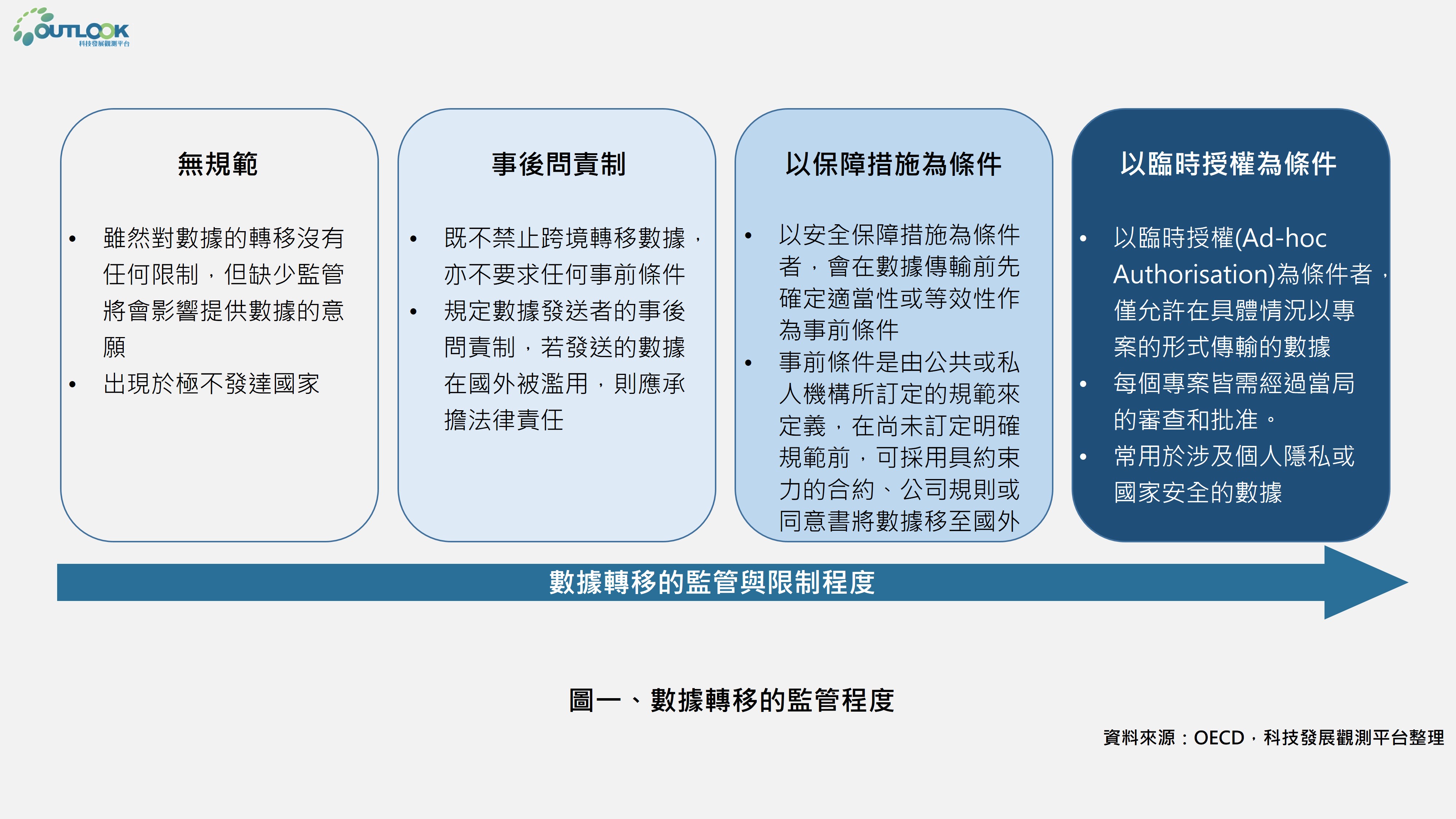 國際標準對於確保商品的品質相當重要,建立產品標準可以降低運輸業和食品業的成本外,建立資訊標準也相當重要,可以減少因產品特性、交易規範間的資訊落差所產生的成本。農產品進出口通常需經過冗長且昂貴的程序,透過數位技術與低成本的系統,能夠幫助企業跨地區發展,並減少監管機構要求所帶來的負擔。如圖一示意圖所示,在沒有任何監管規範下,雖然對數據轉移沒有任何限制,但缺少缺乏保護機制將降低數據提供的意願。