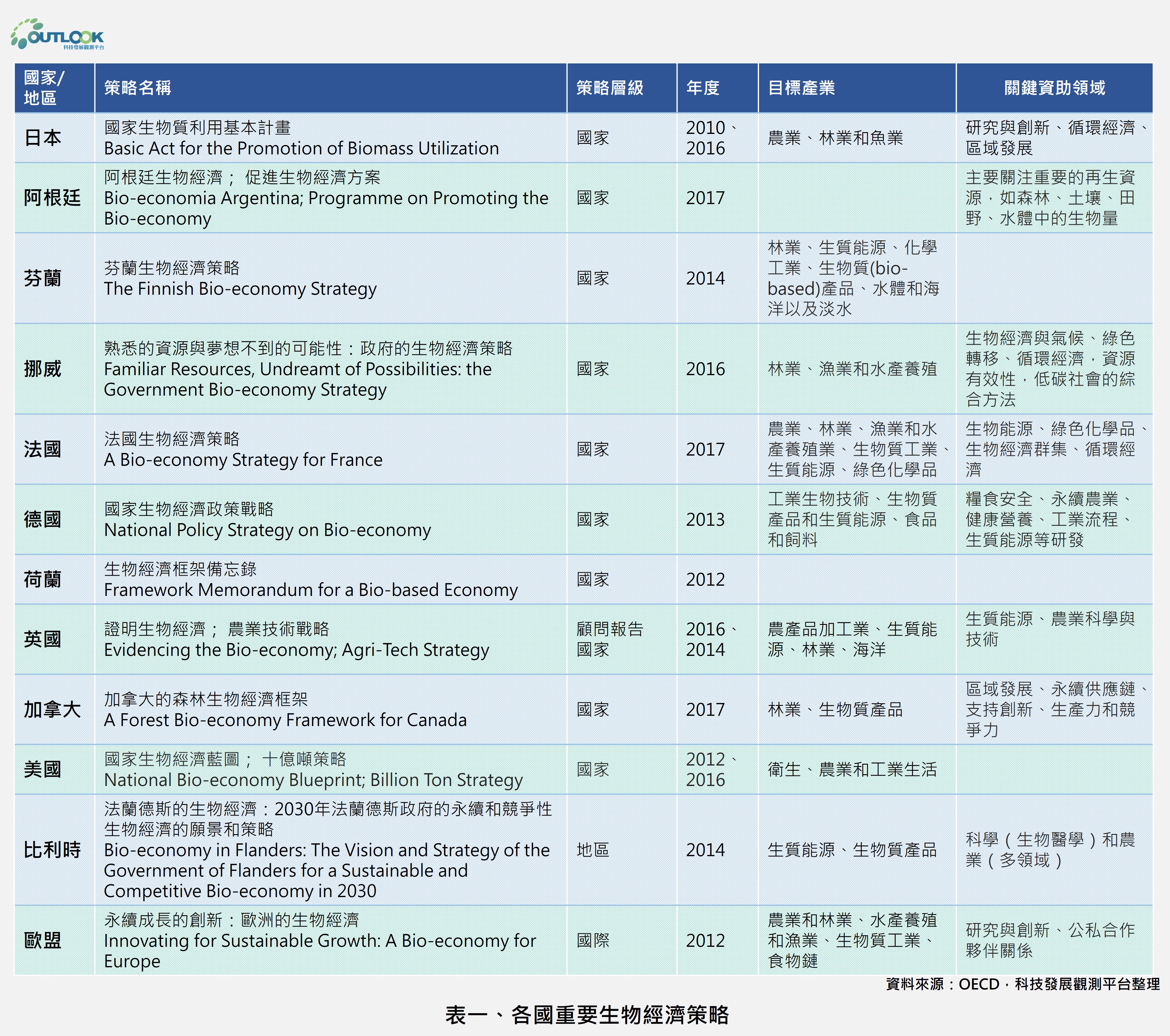 生物經濟政策的制定已是國際主要趨勢,各國正在採取各種促進生物經濟發展的綜合策略和措施(表1)。整體而言,推動生物經濟策略的國家可略分為三種類型,包括有豐富的可再生資源,但缺乏下游加工業的國家、有豐富的原物料與先進加工業的國家,以及雖加工業發達,但缺乏原物料的國家。
