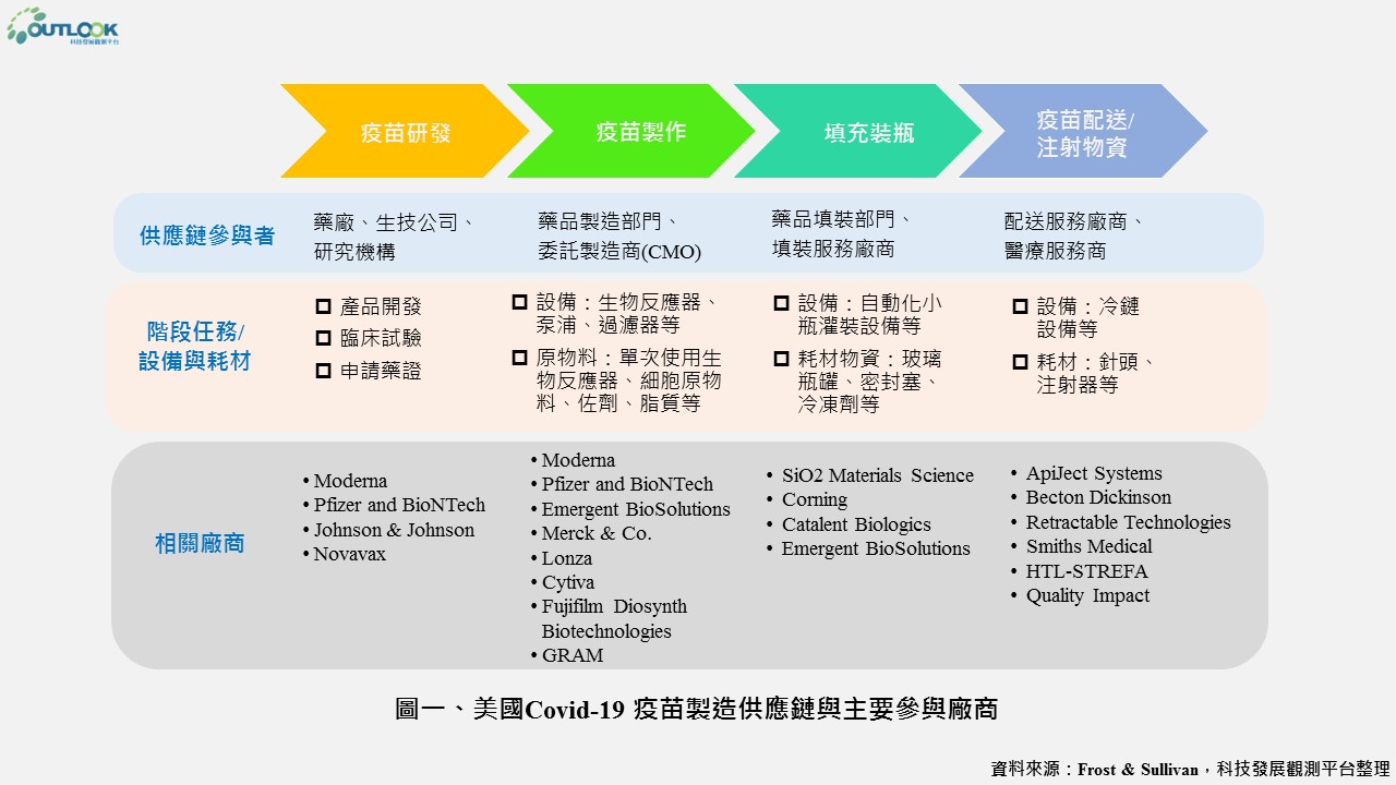 疫苗供應鏈涉及的產業非常多元,由前期的研發單位與機構,取證後的量產與代工製造,以及後續分裝與分送過程的物流與冷鏈等,圖一說明整體供應鏈概況。以下列舉數項供應鏈中之重要項目與參與廠商。