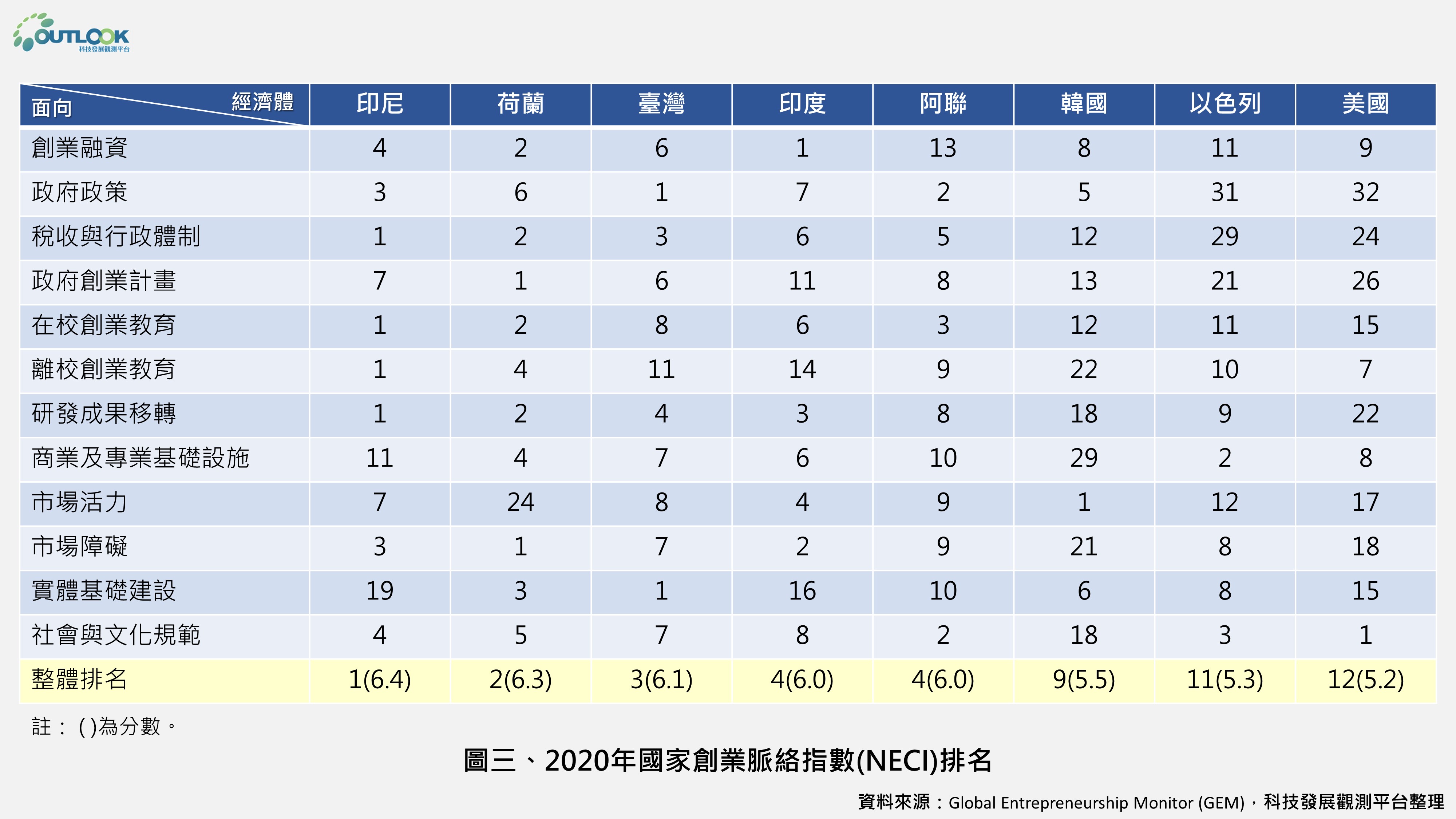 五、創業環境:國家創業脈絡指數(National Entrepreneurship Context Index, NECI)