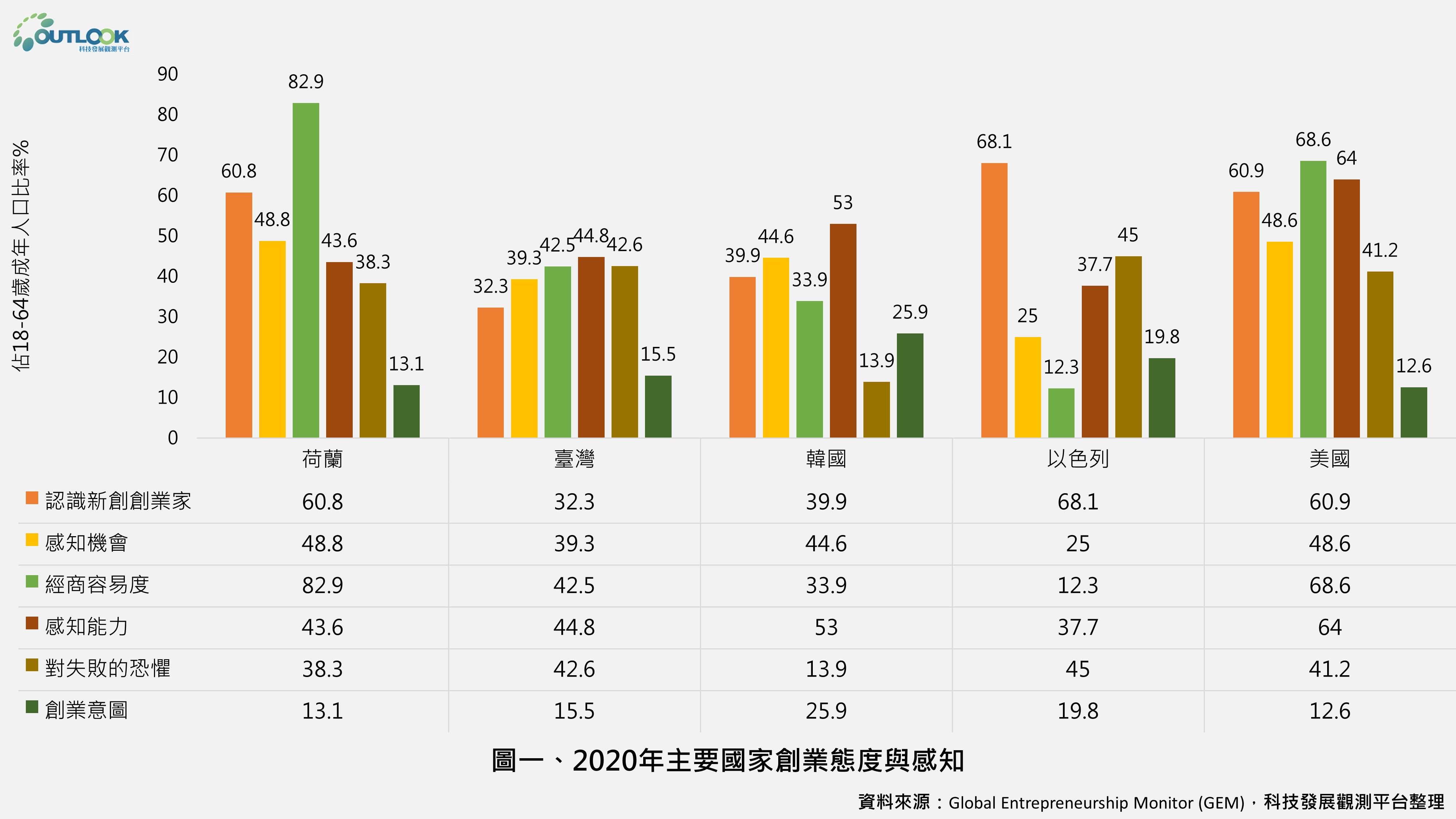 創業的認知與態度是決定是否開始創業或經營事業的開端,受到個人特質如感知機會、承擔風險、企圖心、自信等的影響,以及是否能夠從社會或家庭獲得資源或人脈,也具有相當關鍵性的影響。因為要開創企業必須仰賴許多利害關係人的協助,如供應商、銀行等直接幫助或親友的間接協助,因此認識創業家、機會查覺、知識與自我認知是主要觀察指標。主要國家創業認知與態度調查結果如圖一所示。其中,認識創業家可以創造典範效應,引發創業的動機,臺灣在此項目中可說是敬陪末座,過去兩年內有認識新創創業家的人口佔18-64歲人口比率為32.3%,在43個經濟體中排名第42名。此外,在得知某人因疫情而創業[1]或中止事業[2]的兩個調查項目上,全球整體而言以後者居多,臺灣在此兩項的排名則是殿後。