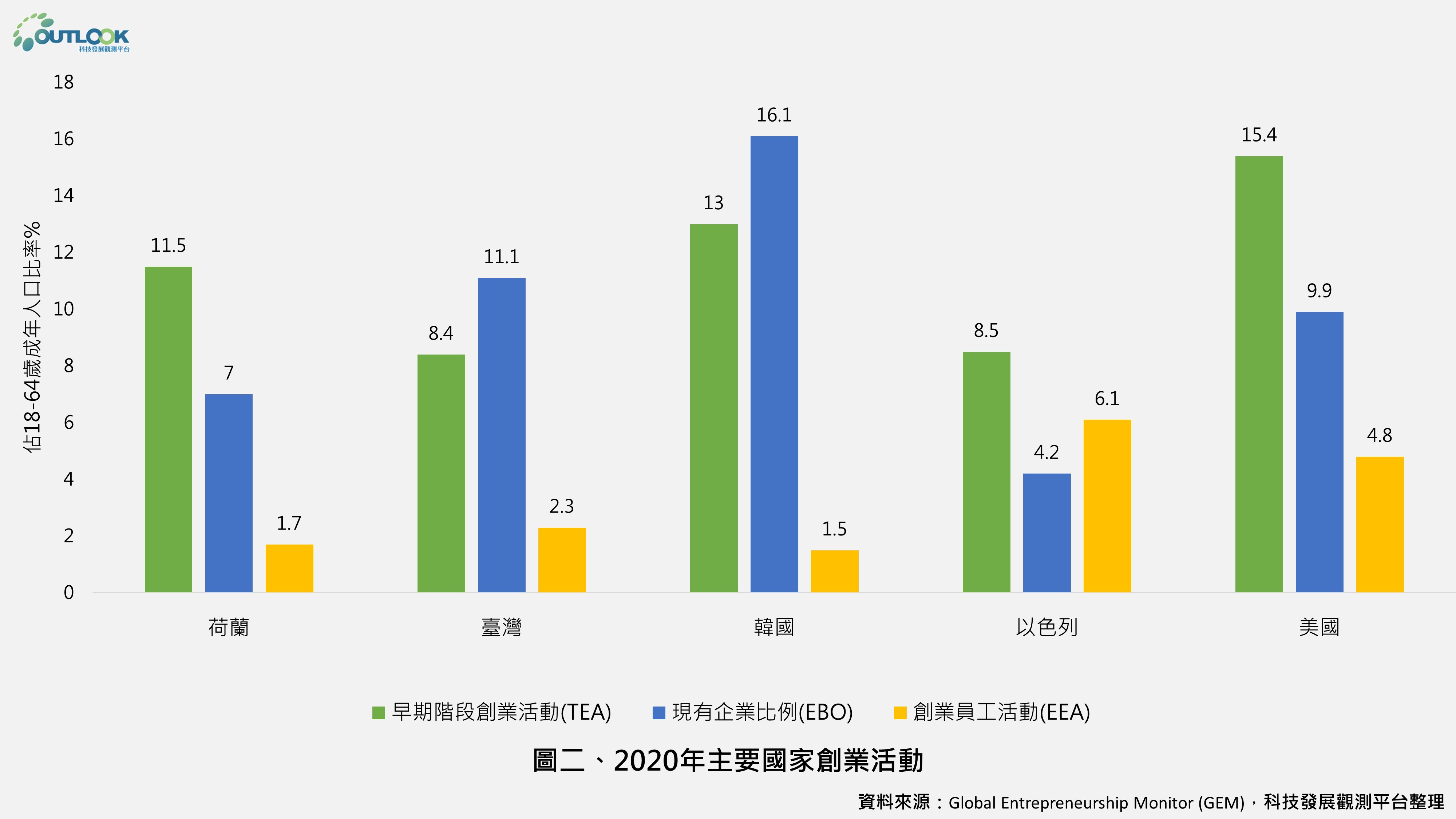其中,TEA為處於早期創業階段的18-64歲成年人口比率;EBO為目前擁有企業超過3.5 年的18-64歲成年人口比率;EEA則為18-64歲企業員工參與創業活動的人口比率。2020年主要國家的創業活動調查結果如圖二所示。以創新聞名的國家,如美國、荷蘭等國的TEA比EBO要高;臺灣的TEA比率則相對較低。EEA的比率,以歐洲與北美地區的風氣最為鼎盛,中東地區的以色列也不遑多讓,而臺灣則在亞洲地區居冠。此外,分析新冠肺炎疫情對TEA的影響,整體而言,TEA從疫情看到新商機的比率,要比EBO來得樂觀許多。從產業別來看,企業服務類的TEA能從疫情發掘出商機的國家不多,反倒是消費者服務類的TEA能從疫情嗅到商機的比率高出許多。
