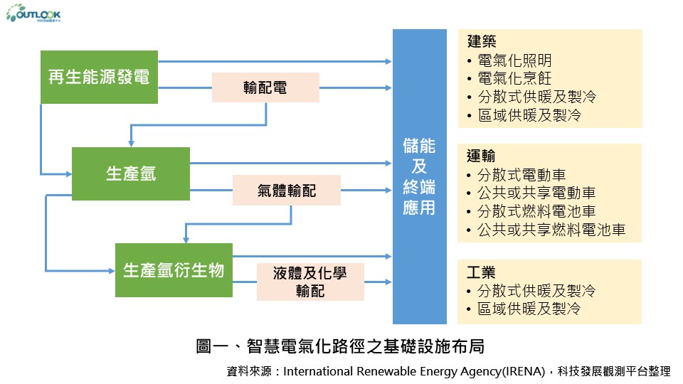 IRENA彙整全球建築、交通和工業部門各種終端應用的化石燃料替代方案,將智慧電氣化的解決路徑分為直接消耗電力的直接電氣化(direct electrification),與先將電力轉換為另一種能量載體(如氫氣)的間接電氣化(indirect electrification)兩大類,並依解決路徑擬定基礎設施之佈局(圖一)。