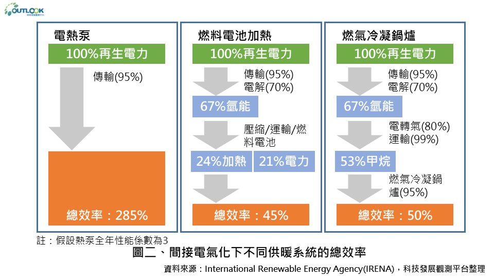 對於難以脫碳的產業,由再生能源電解產生的氫及衍生的電子燃料(e-fuels),可以間接使用電氣化的方式協助產業實現脫碳目標。然而,生產氫或其他電子燃料時,通常會產生比需求更多的轉換損失(圖二),對再生能源的電力需求也將高於直接電氣化使用(製氫所需的電解槽、電熱泵)。因此,透過以下智慧策略解決這些潛在問題。