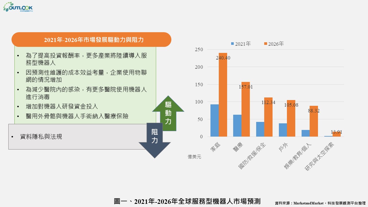 服務型機器人市場預計將從2020年的301億美元,成長至2026年的1033億美元,2021年至2026年間的複合年成長率(CAGR)為23.3%。MarketandMarket將服務機器人應用領域分為:家庭應用、醫療、戶外、國防/救援/保全、檢查與維護、物流、娛樂/教育/個人、營建與拆除、公共關係、海洋應用、研究與太空探索。2020年市場占比前四大為家庭、醫療、國防/救援/保全、戶外,在2021年-2026年預測期間中,各領域皆大幅成長,但市場規模排序在期間內無變化,統計與預測數據如圖一,下列摘述服務型機器人在家庭、醫療、 國防/救援/保全、娛樂/教育/個人,以及研究與太空探索的市場發展。