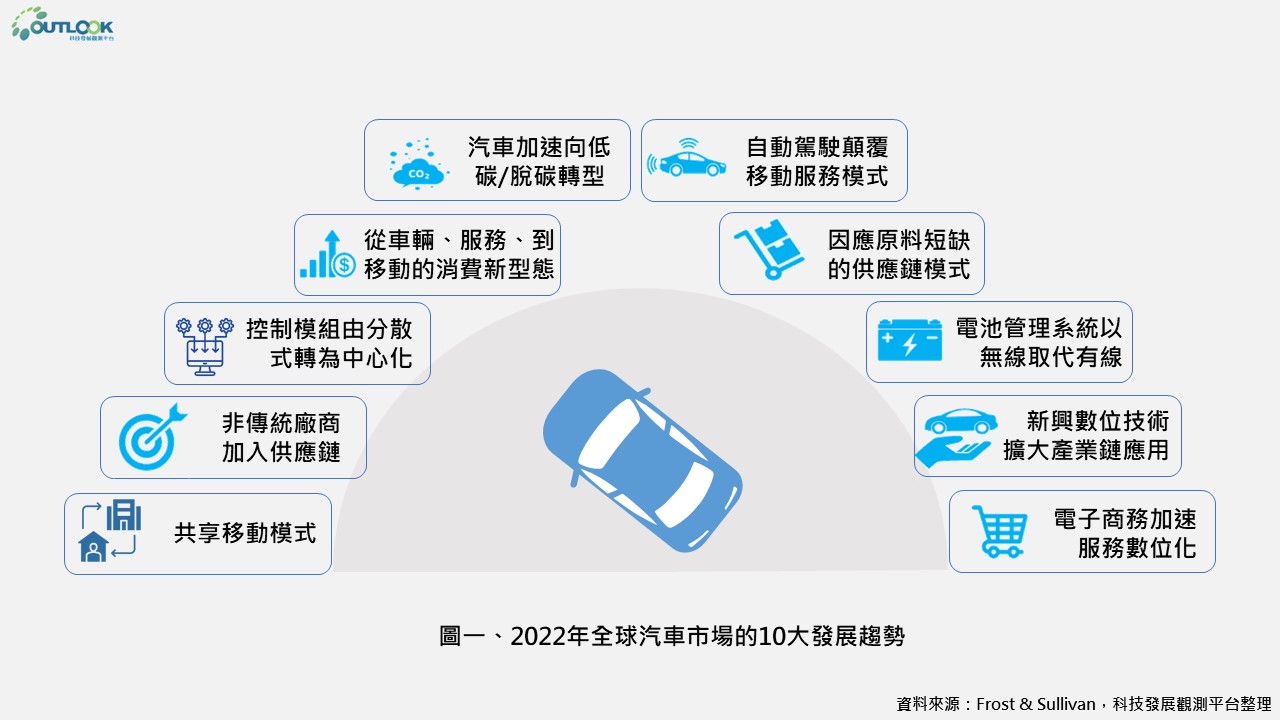 儘管晶片短缺等供應鏈問題以及馬來西亞與泰國等亞洲車輛生產重鎮的防疫封鎖措施,導致汽車生產與交貨的時間延遲,但在全球經濟復甦與多國推出新能源車購車獎勵措施的激勵下,2021年全球汽車銷量仍較2020年成長5.3%,達8,100萬輛;而居家辦公與移居非都會區等生活習慣的改變,也帶動共享移動市場的強勁反彈並孕育出許多新的商業模式,電動車銷量的穩定成長亦驅動自動駕駛功能的精進,駕駛與乘客對乘車娛樂體驗的重視則催生新的互聯服務技術的出現。面對蓬勃發展的汽車市場,此篇由Frost & Sullivan所發布的展望報告,從主要車輛製造商、電動車、共享移動、車聯網、自動駕駛與車輛維修及周邊服務等各層面深入探討全球汽車產業的2021年發展特點,並展望未來10大關鍵發展趨勢(圖一),以下為發展趨勢之重點說明:
