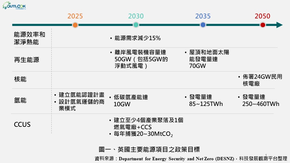 英國國家能源政策旨在確保可供應兼具安全性、可靠性且可負擔的能源,並建置實踐脫碳目標所需的大型基礎設施。2021年10月,英國發布淨零排放策略,制定2035年將較1990年的溫室氣體排放量減少78%的目標,並闡述英國淨零經濟轉型的願景,及所有部門實現2050年脫碳的策略。