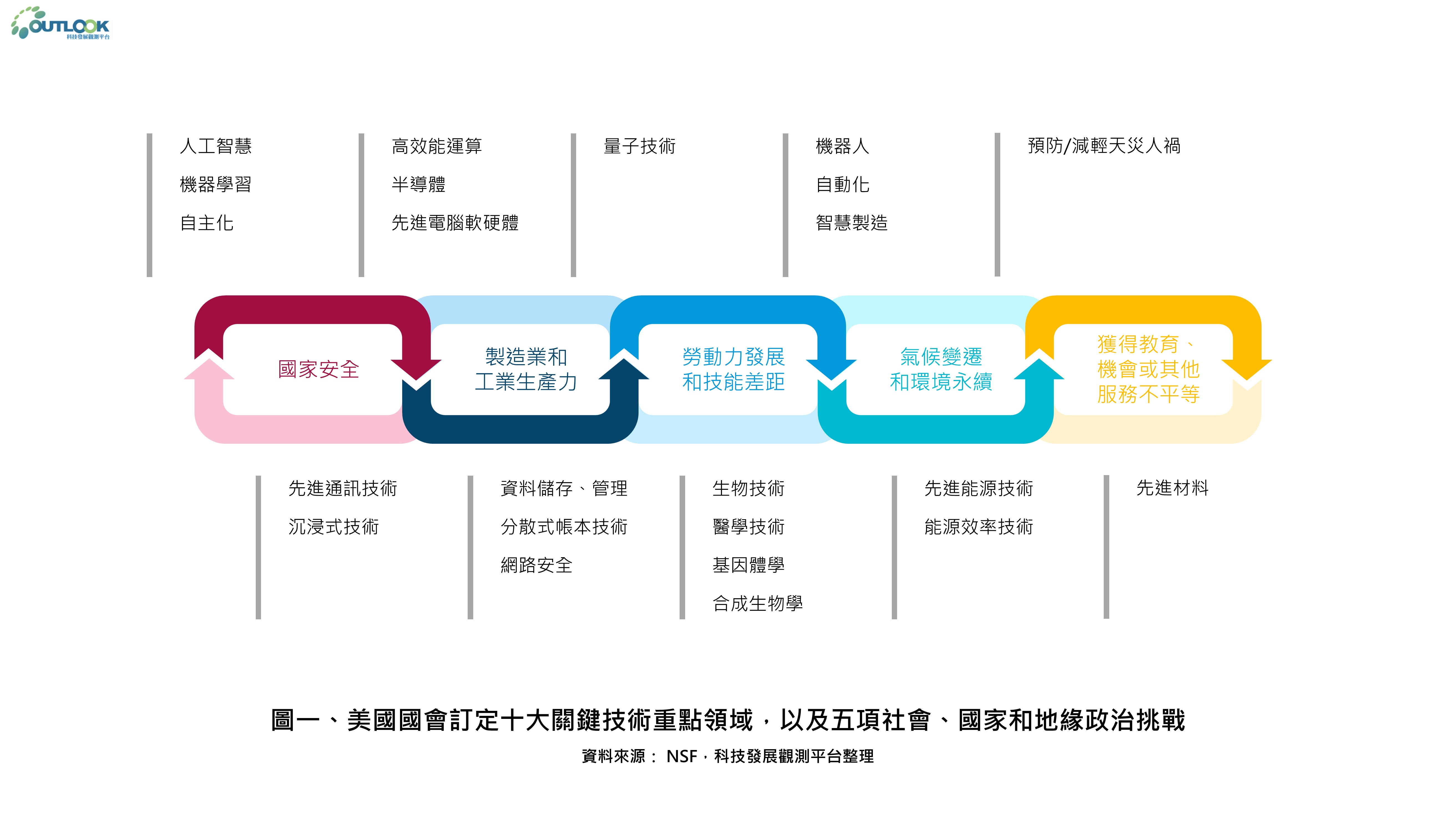 如圖一所示,美國國會在授權NSF設立新單位TIP時,亦初步訂定了十項關鍵技術重點領域,並責令TIP制定三年路線圖,引導由使用啟發的研究(Use-Inspired Research)[註1]及轉化研究(Translational Research)[註2]之發展,並確保其投資決策能有效提高美國在關鍵技術重點領域之競爭力,同時,透過TIP所支持的研究來解決社會、國家和地緣政治挑戰。
