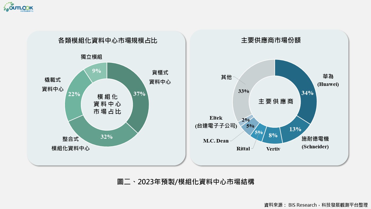 2023 年模組化資料中心市場以貨櫃式與整合式模組化資料中心為主要型式,兩者合計占比將近七成,其他兩類型的市場規模占比請參閱圖二。在供應商市場份額方面,華為以34% 位居領先,其次依序為施耐德電機(13%)以及Vertiv(8%)。而台達電子的子公司 Eltek 則約占2% (其他供應商數據詳見圖二)。以下將從市場成長動能以及挑戰與機會兩方面,探討模組化資料中心之發展趨勢。
