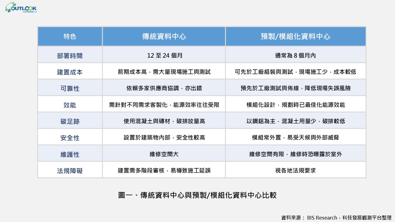 預製化與模組化資料中心(Prefabricated and Modular Data Centers,以下簡稱模組化資料中心),近年來已成為資料中心產業的重要創新方向。其核心概念是將 IT 系統、電力與冷卻等關鍵設施整合為標準化模組,並於工廠內預先製造與完成測試,再運至建置地點進行快速組裝。相較於傳統資料中心需長達 12 至 24 個月才能完成建置,且在初期往往難以達成能源與冷卻效率最佳化,模組化資料中心不僅能在約 8 個月內完成部署,還能透過出廠前的完整測試確保其運作可靠度與效率。(兩類資料中心比較請參閱圖一。)