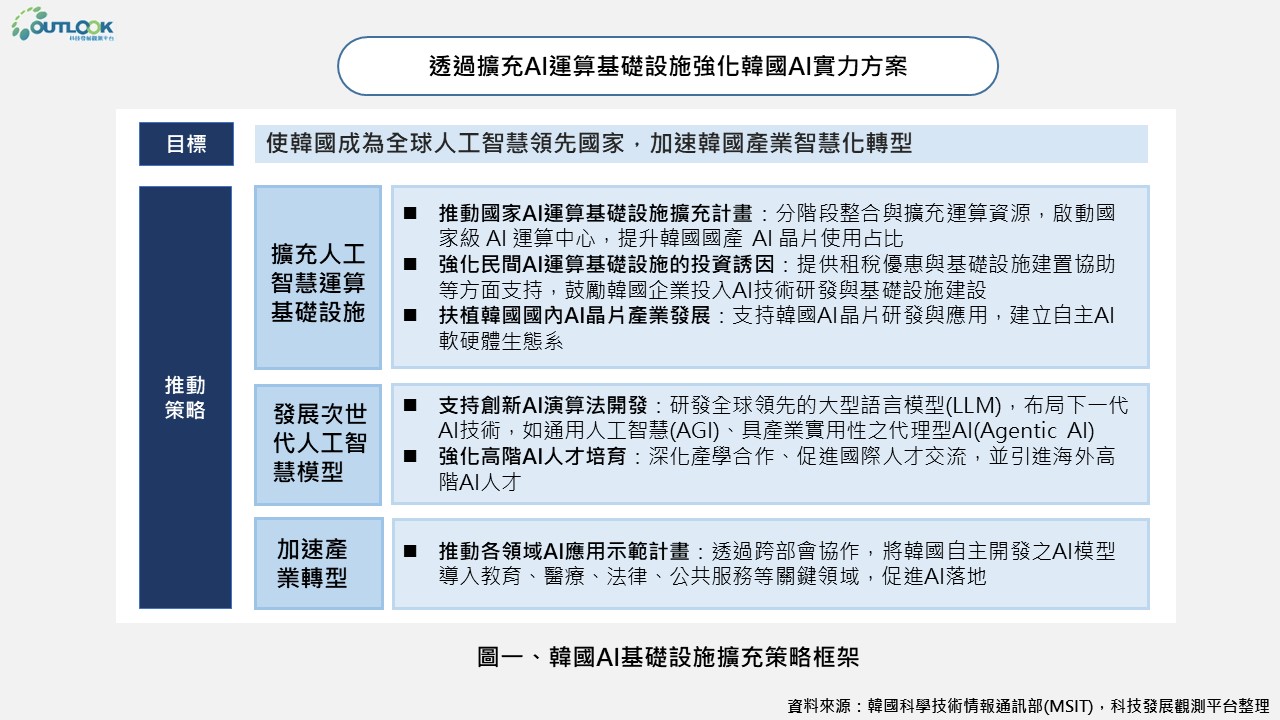 為了強化韓國AI競爭力,韓國科學技術情報通訊部(MSIT)於2025年2月發布《透過擴充AI運算基礎設施強化國家AI實力方案》(AI인공지능 컴퓨팅 인프라 확충을 통한 국가 AI 역량 강화 방안),提出涵蓋基礎建設、人才、技術與應用等面向的政策規劃,旨在將韓國打造為全球頂尖的AI強國,並加速國內產業的智慧化轉型與升級。
