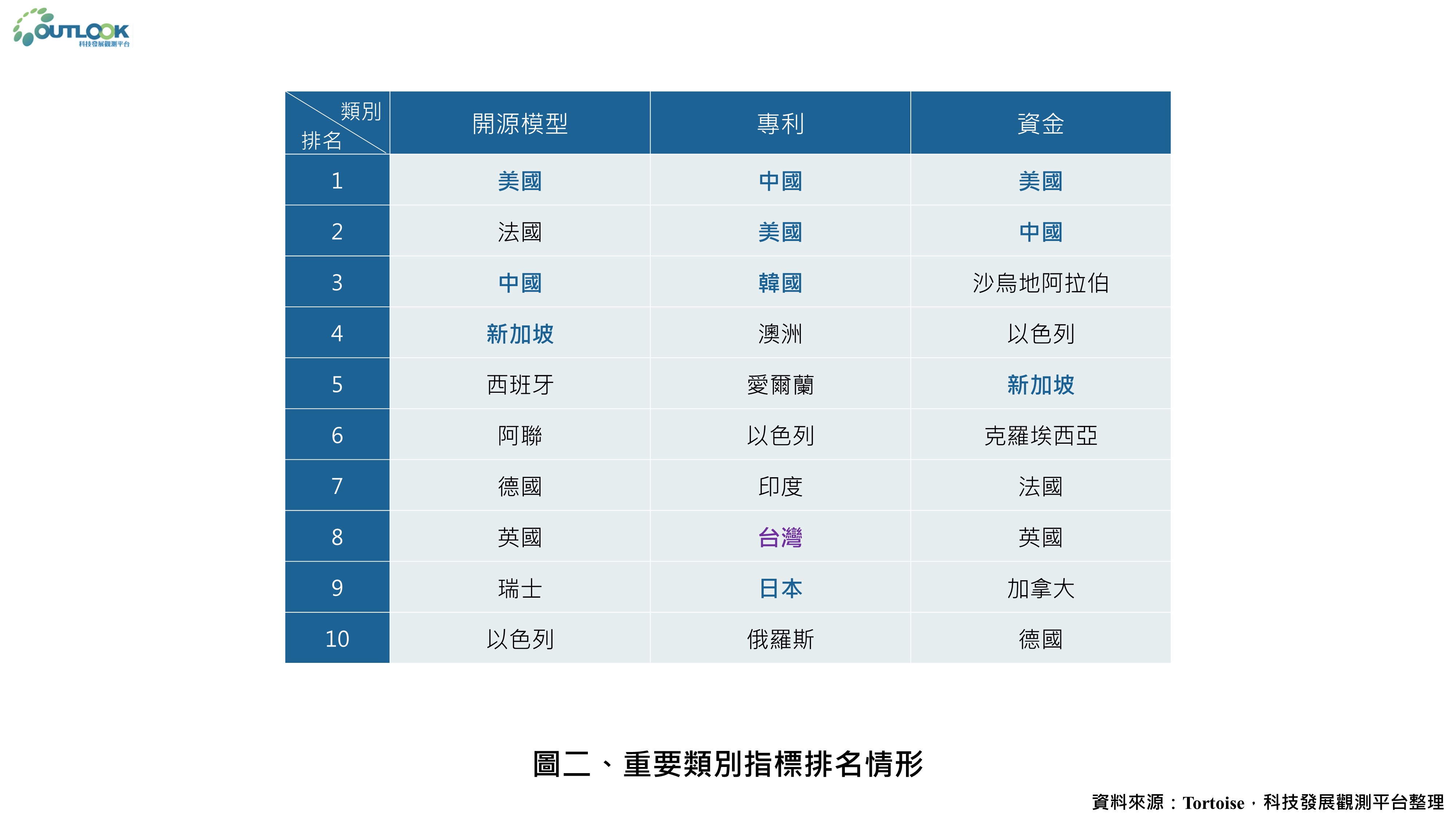 圖二為三大權重較高的類別指標排名情形,美、中大國表現佳,三項類別指標排名均在前3名。亞洲國家之一的新加坡亦表現不俗,在「開源模型」類別指標排名第4名;在「資金」類別指標排名第5名。我國則在「專利」類別指標方面表現佳,位列第8名,優於日本(第9名)。