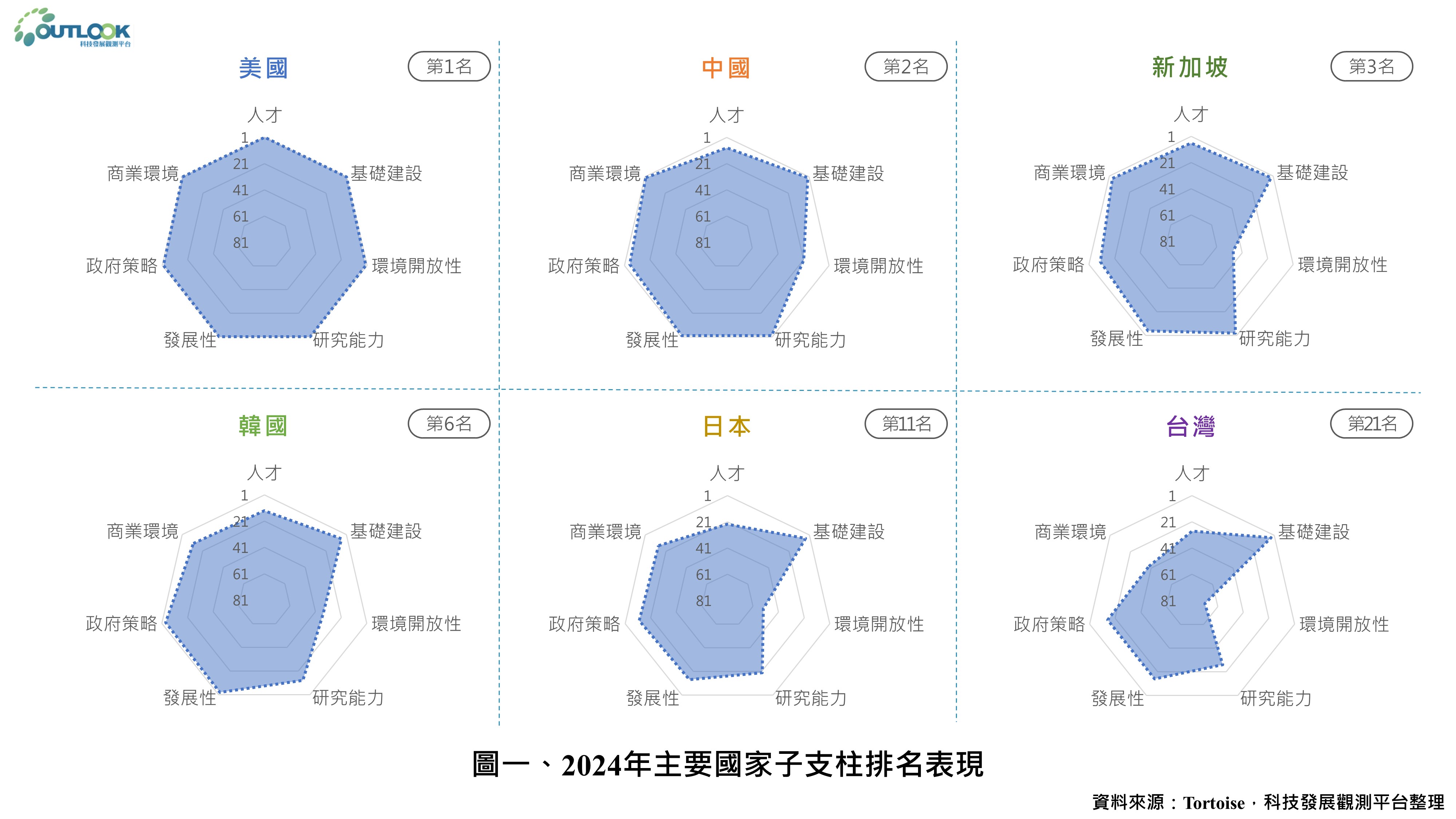 GAII將AI能力細分為「規模」與「強度」,「規模」指各項指標的絕對數值,能力最強的國家為美國與中國,韓國第7名,日本第9名,新加坡第11名,台灣第17名;「強度」則納入該國人口或GDP進行計算,能力最高的國家依序為新加坡、以色列、美國與瑞士,韓國第11名,中國第21名,台灣第28名,日本第31名。主要國家在各子支柱的排名表現如圖一所示: