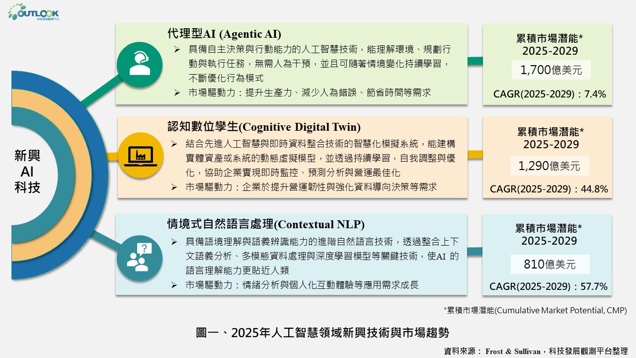 Frost & Sullivan 在綜合評估市場潛力、專利佈局、募資動態、2025 年主流趨勢與經濟影響力等關鍵要素後,今年亦於人工智慧技術領域,評選出多項預期在未來 2 至 4 年內對社會帶來深遠影響的新興技術,其中包括:代理型AI (Agentic AI)、認知數位孿生(Cognitive Digital Twin)、情境式自然語言處理(Contextual NLP)等。本文將針對前述3項新興技術,分別介紹其定義、應用範疇、技術特點、發展趨勢以及代表性案例等(各項新興技術摘要與發展潛力請參閱圖一)。
