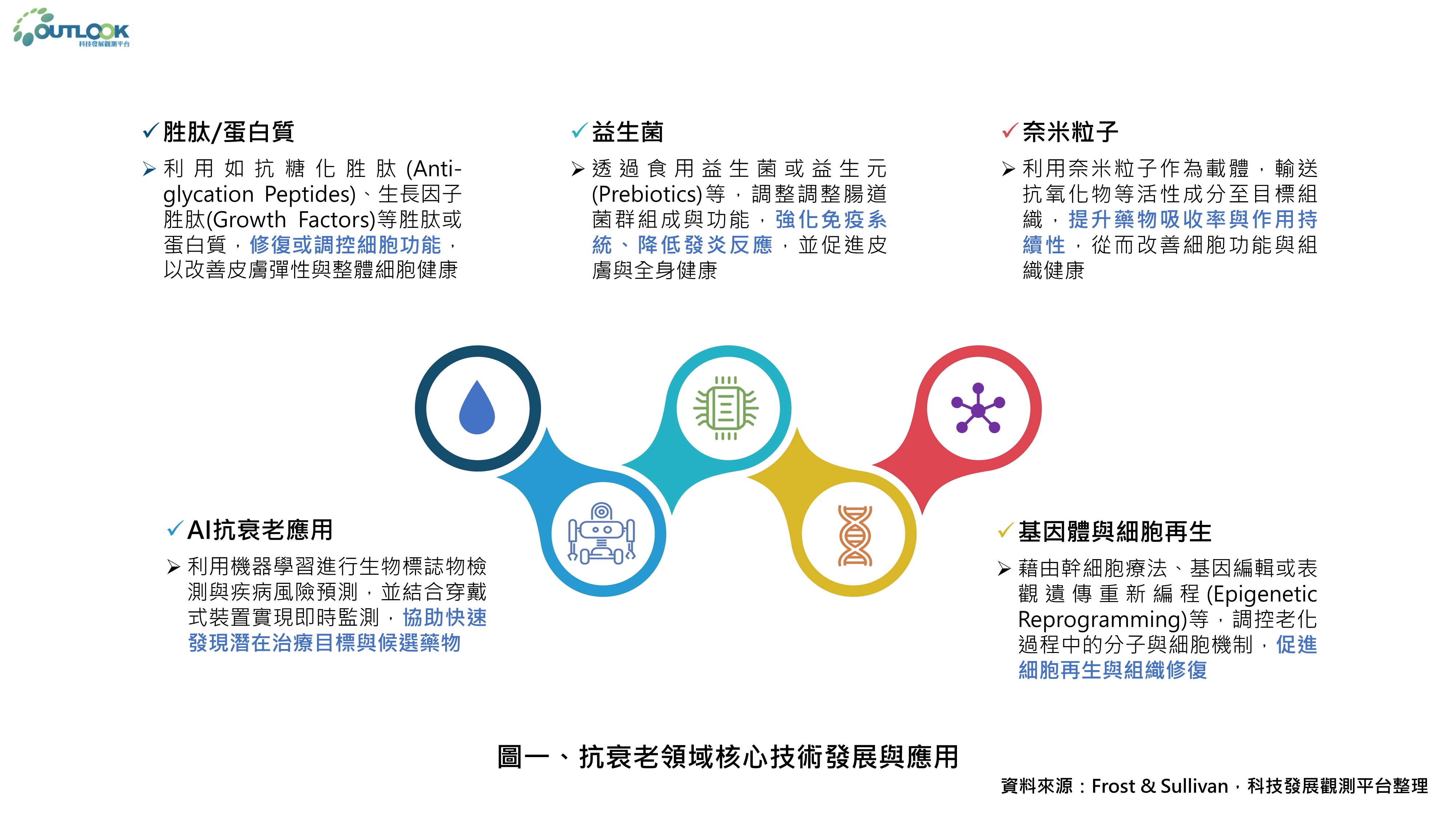 目前,人工智慧主要應用於發現與驗證與老化相關的生物標誌物,並透過分析臨床資料,探索藥物再利用(Drug Repurposing)的可能性,加速既有藥物轉化為抗衰老療法,縮短新療法的研發時間。Frost & Sullivan 預測在2026至2027年,新一代人工智慧系統將被引入,能整合環境因素、生活型態與即時健康數據,預測患者對特定藥物的反應,並推薦更合適的治療組合。2027 年之後,人工智慧將與穿戴式裝置與生物感測器(Biosensors)深度結合,實現對人體衰老狀態的即時監測。同時,大規模全球資料庫也將逐步建立,進一步優化老化模型,使人工智慧在設計與落實個人化抗衰老策略上發揮更關鍵的作用。