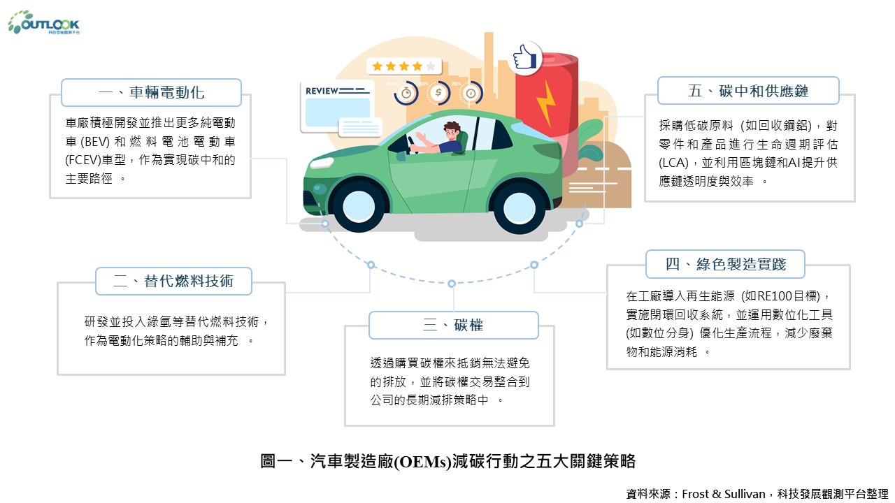 隨著全球邁向淨零碳排的目標,汽車產業亦同步加速調整製造與供應體系,以實現永續轉型。根據Frost & Sullivan,汽車製造商(OEMs)正透過五大關鍵策略推動碳中和轉型(圖一):