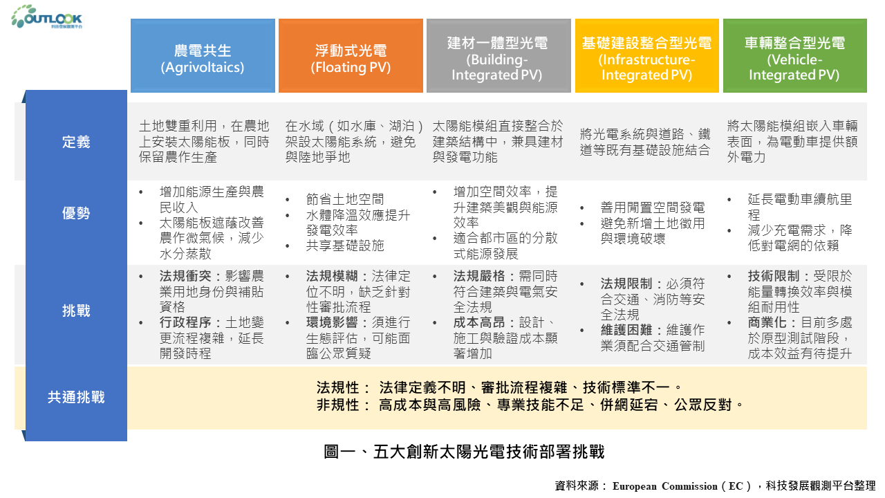 為突破瓶頸,歐盟積極推動創新太陽光電部署模式(Innovative Forms of Solar PV Deployment),以開拓新應用場域並提升能源系統韌性。歐盟能源總署(Directorate-General for Energy, DG ENER)於2025年發布「創新太陽光電部署障礙分析與建議」(Barriers for Innovative Forms of Solar PV Deployment and Associated Recommendations),聚焦五種創新太陽光電部署模式:農電共生(Agrivoltaics)、浮動式太陽光電(Floating PV, FPV)、建材一體型太陽光電(Building-Integrated Photovoltaics, BIPV)、基礎建設整合型太陽光電(Infrastructure-Integrated PV, IIPV)以及車輛整合型光電(Vehicle-Integrated PV, VIPV),並就法規環境、技術特性、經濟可行性與社會接受度等面向進行分析,並於 2025 年由歐盟執委會發布最新政策建議,將創新部署與創新技術納入更明確的法律與政策框架。