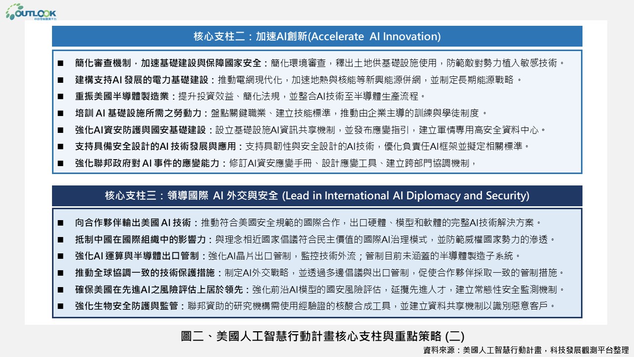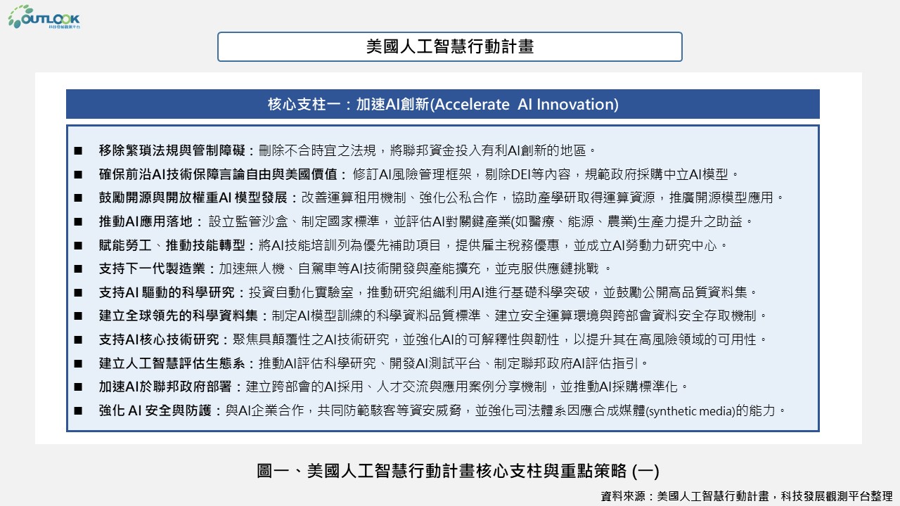 人工智慧(AI)技術的發展,正逐步改變人們的生活與工作方式。為確保美國在全球AI競賽中維持領先,美國白宮於2025年7月發布《贏得競爭:美國AI行動計畫》(Winning the Race: America’s AI Action Plan)政策文件。該計畫的核心原則為將美國勞工置於首位,強調AI應作為輔助工具,為勞工創造高薪機會並提升生活品質,而非取代其工作。此外,計畫主張AI系統應保持客觀與中立,不得帶有意識形態偏見,並提供可信賴的資訊來源。同時,美國也將採取措施防範先進AI技術被惡意濫用或竊取,並持續監控AI相關的潛在風險。此行動計畫聚焦於三大核心支柱,分別為:加速AI創新(Accelerate AI Innovation)、建設AI基礎設施(Build American AI Infrastructure),以及領導AI國際外交與安全(Lead in International AI Diplomacy and Security)。以下將分別介紹各支柱的關鍵推動策略,推動策略摘要請參閱圖一與圖二。